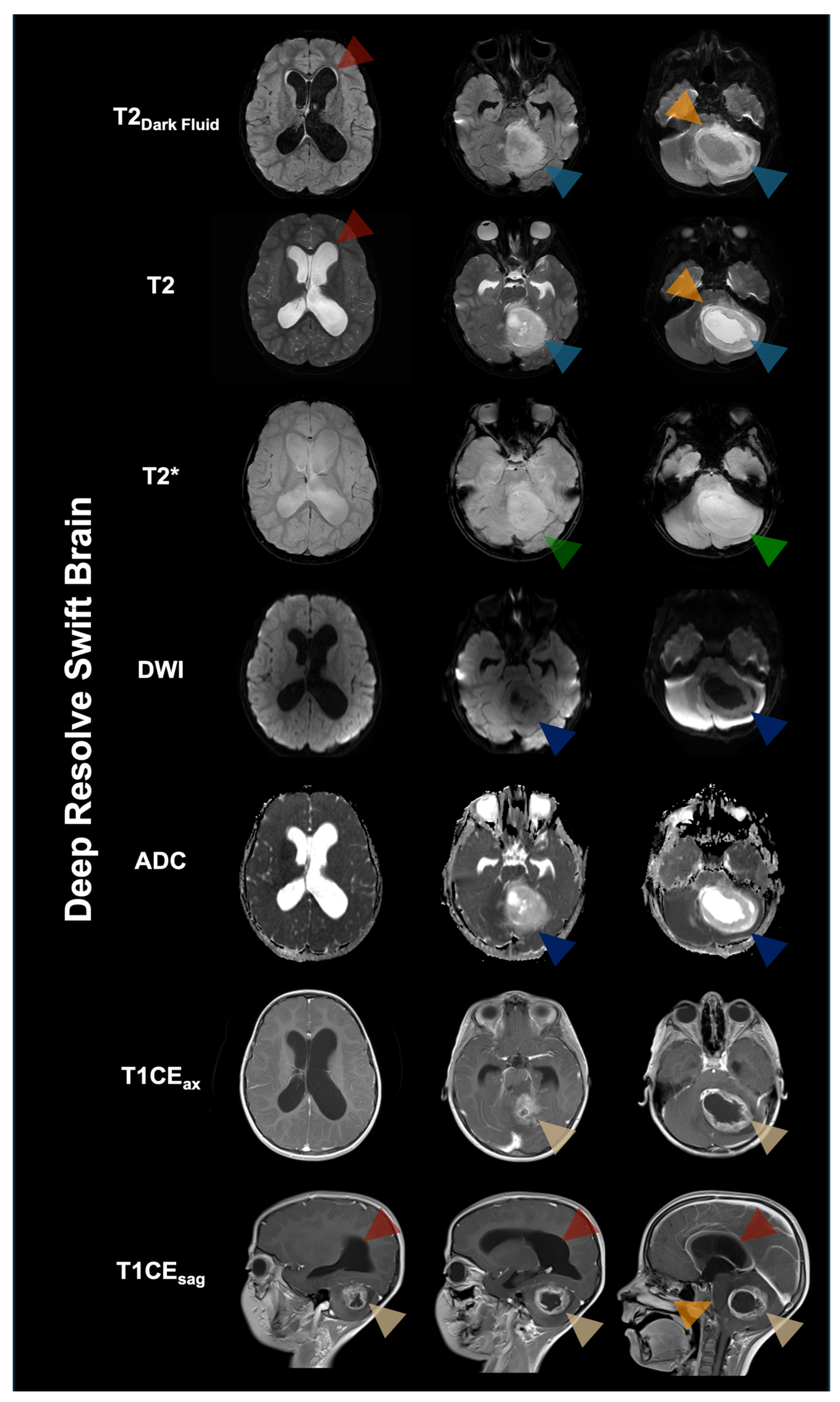 - Moon, H.E.; Ha, J.Y.; Choi, J.W.; Lee, S.H.; Hwang, J.Y.; Choi, Y.H.; Cheon, J.E.; Cho, Y.J. Ultrafast MRI for Pediatric Brain Assessment in Routine Clinical Practice. Korean J. Radiol. 2025, 26, 75–87. [Google Scholar] [CrossRef]