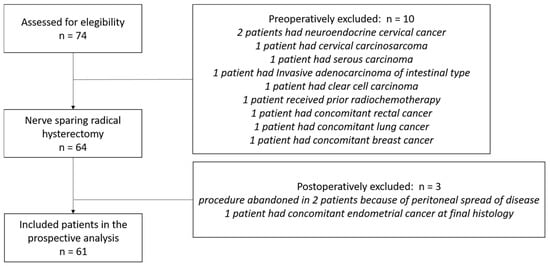 Between January 2020 and December 2024, 74 consecutive patients aged over 18 years with newly diagnosed cervical cancer underwent radical hysterectomy at our institution. Thirteen patients were excluded based on pre-specified criteria, leaving 61 patients for analysis (Figure 1).
