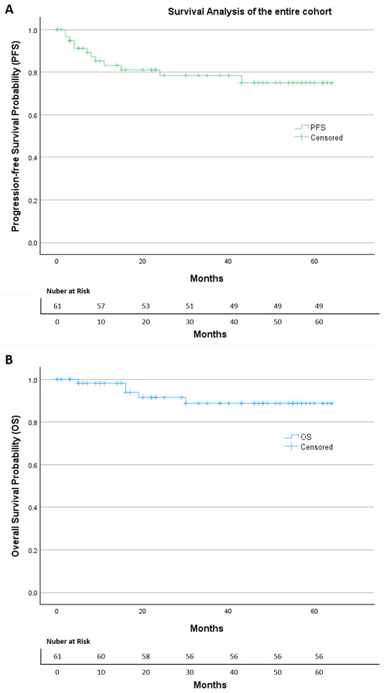 After a median follow-up of 38 months, Kaplan–Meier analysis of the entire cohort (Figure 2) showed a progression-free survival (PFS) rate of 80.3%, with an estimated mean PFS of 51.4 months (95% CI: 45.0–57.7). The overall survival (OS) rate was 91.8%, with an estimated mean OS of 58.9 months (95% CI: 54.6–63.1).