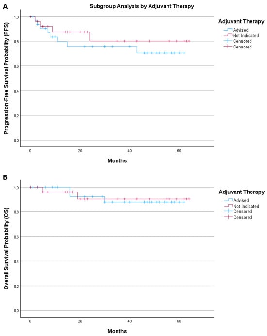An exploratory subgroup analysis was performed to assess survival according to adjuvant therapy status (Figure 4). Patients were stratified into those for whom adjuvant treatment was advised and those for whom adjuvant therapy was not indicated.