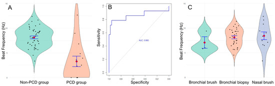 (A) Mean ciliary beat frequency in the non-PCD group (green) and the PCD group (orange). (B) ROC curve. (C) Ciliary beat frequency in bronchial brushes (green, n = 3), bronchial biopsies (orange, n = 35), and nasal brushes (blue, n = 12).