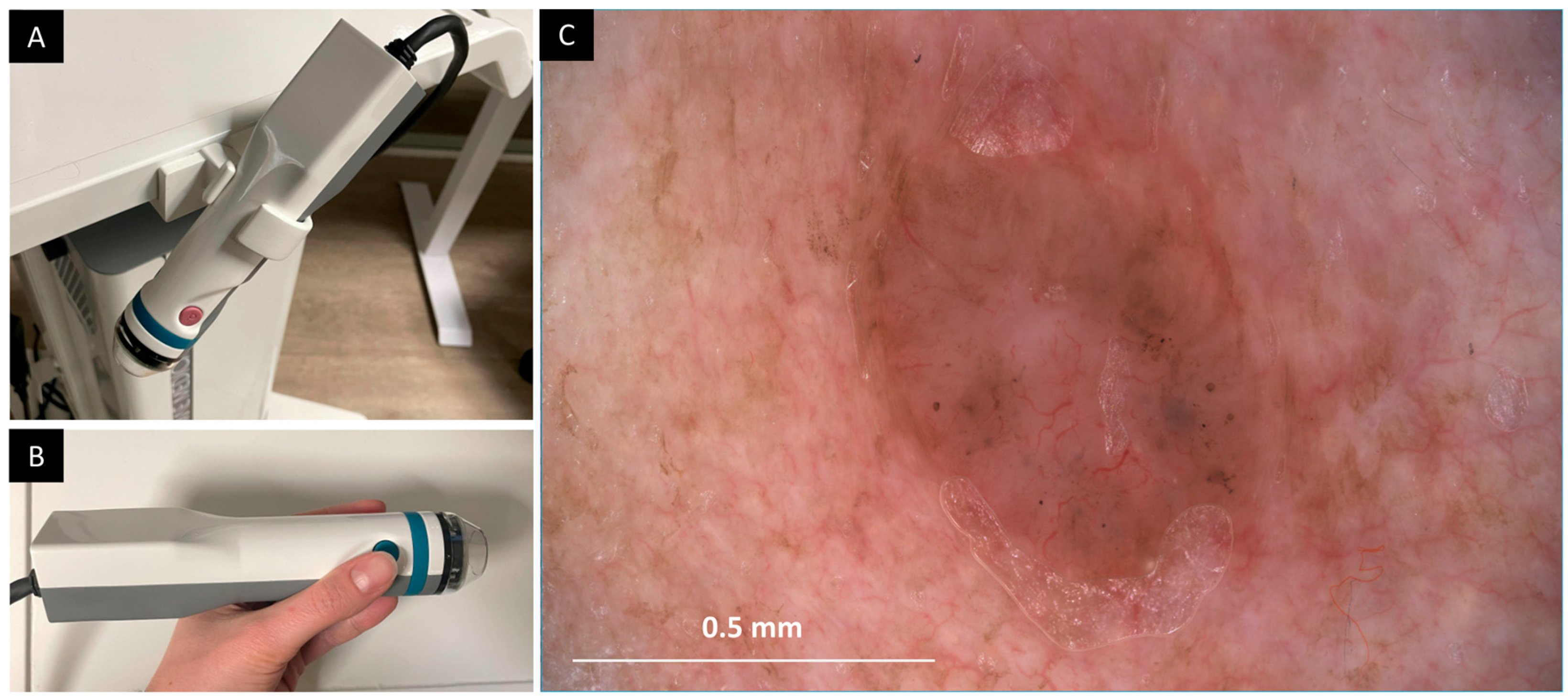 - Boostani, M.; Pellacani, G.; Wortsman, X.; Suppa, M.; Goldust, M.; Cantisani, C.; Pietkiewicz, P.; Lőrincz, K.; Bánvölgyi, A.; Wikonkál, N.M.; et al. FDA and EMA-approved noninvasive imaging techniques for basal cell carcinoma subtyping: A systematic review. JAAD Int. 2025, 21, 73–86. [Google Scholar] [CrossRef] [PubMed]