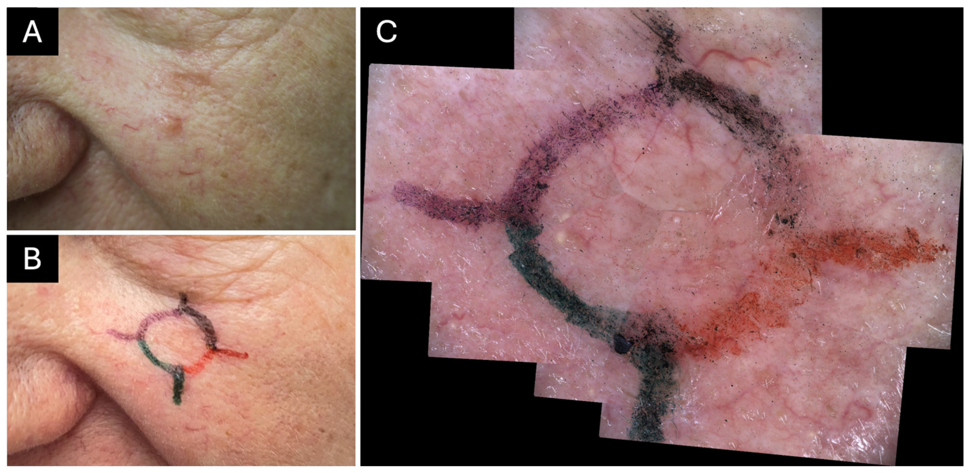 - Janowska, A.; Oranges, T.; Granieri, G.; Romanelli, M.; Fidanzi, C.; Iannone, M.; Dini, V. Non-invasive imaging techniques in presurgical margin assessment of basal cell carcinoma: Current evidence. Skin Res. Technol. 2023, 29, e13271. [Google Scholar] [CrossRef]