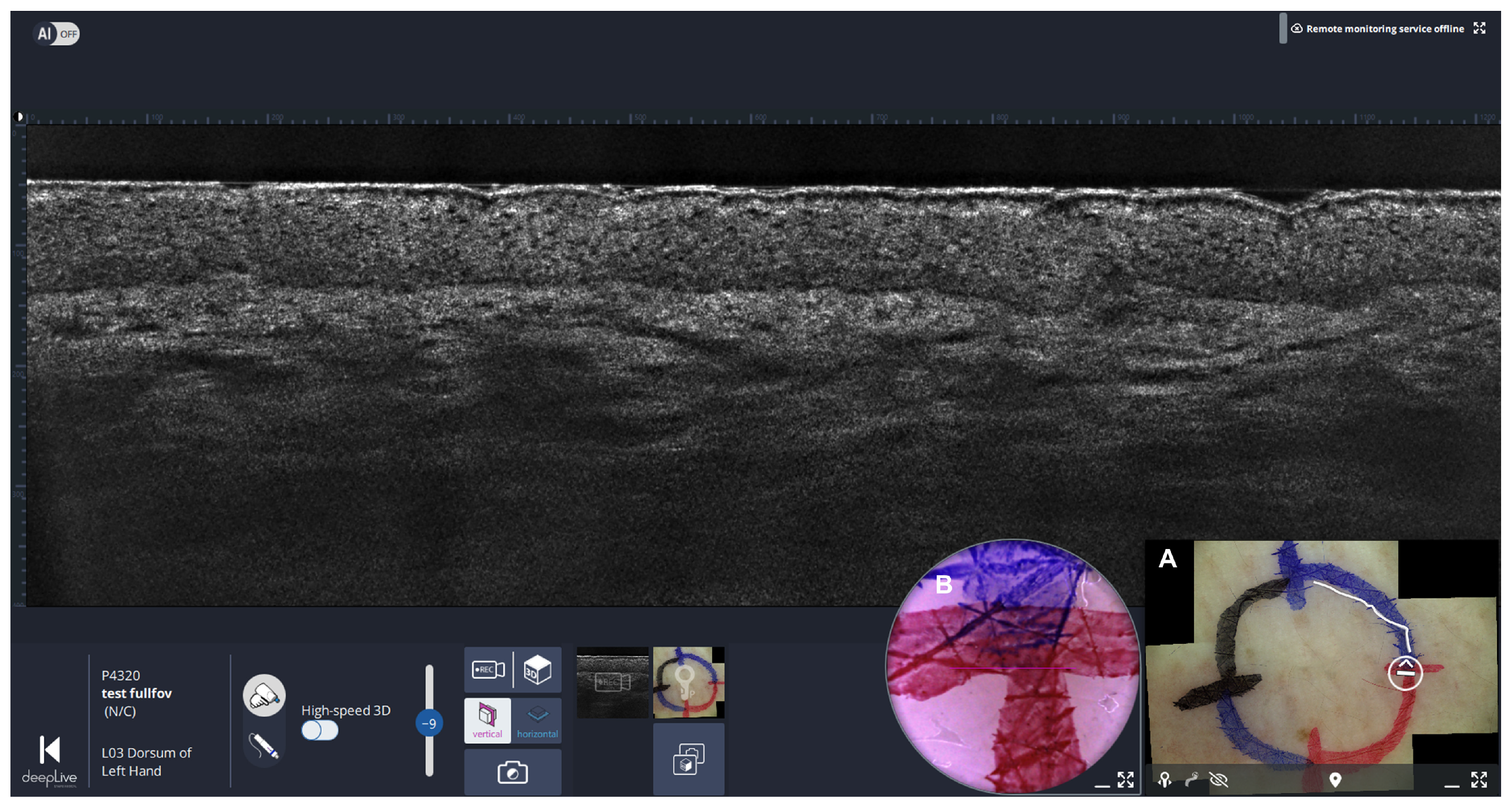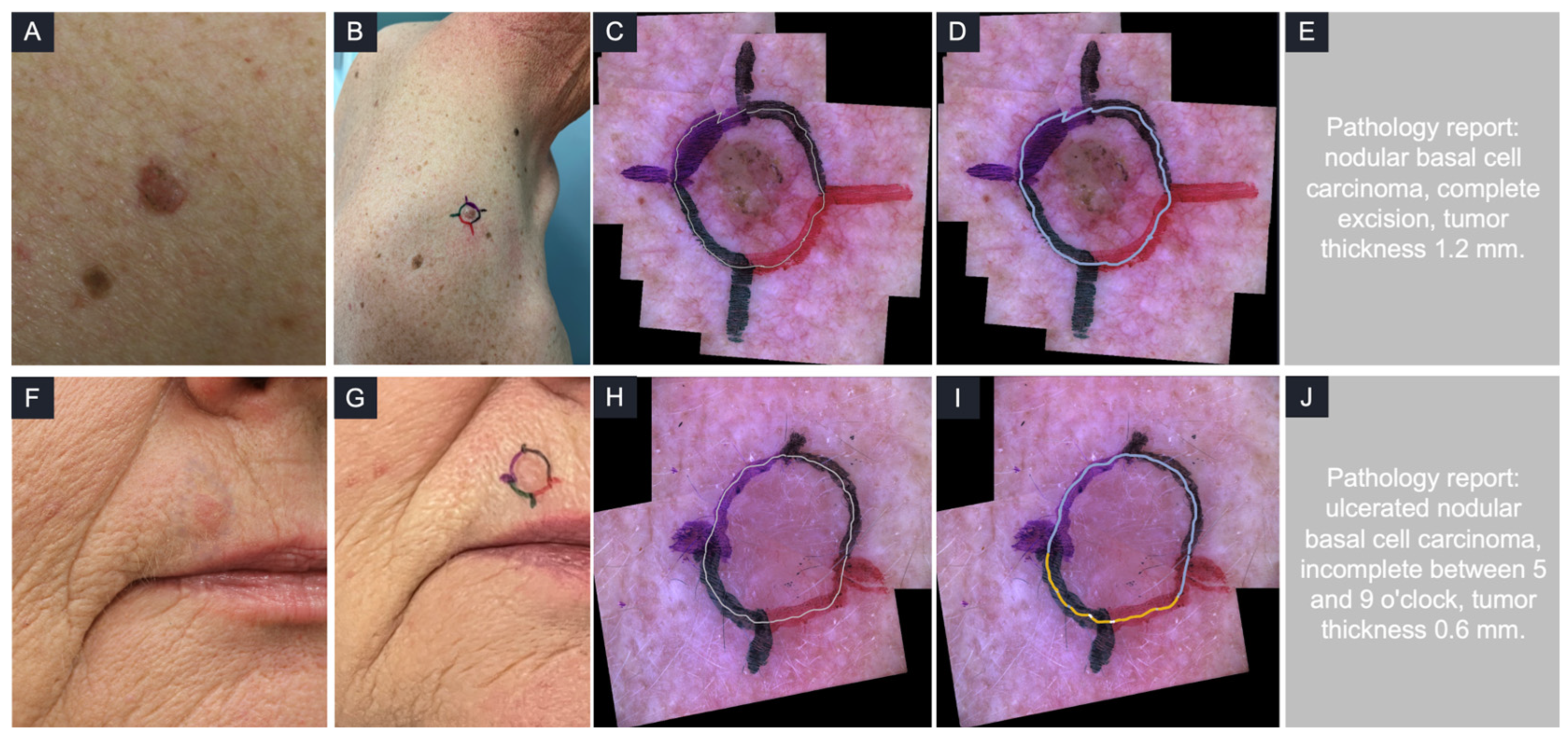 - Deußing, M.; Eijkenboom, Q.L.; Thamm, J.; Desch, A.; Fünfer, K.; Mozaffari, M.; Wirsching, H.; Mayer, O.; Schlingmann, S.; French, L.E.; et al. Unveiling the hidden boundaries: AI-assisted line-field optical coherence tomography margin mapping for precise excision of basal cell carcinoma—A step-by-step tutorial. Skin Res. Technol. 2024, 30, e13594. [Google Scholar] [CrossRef] [PubMed]