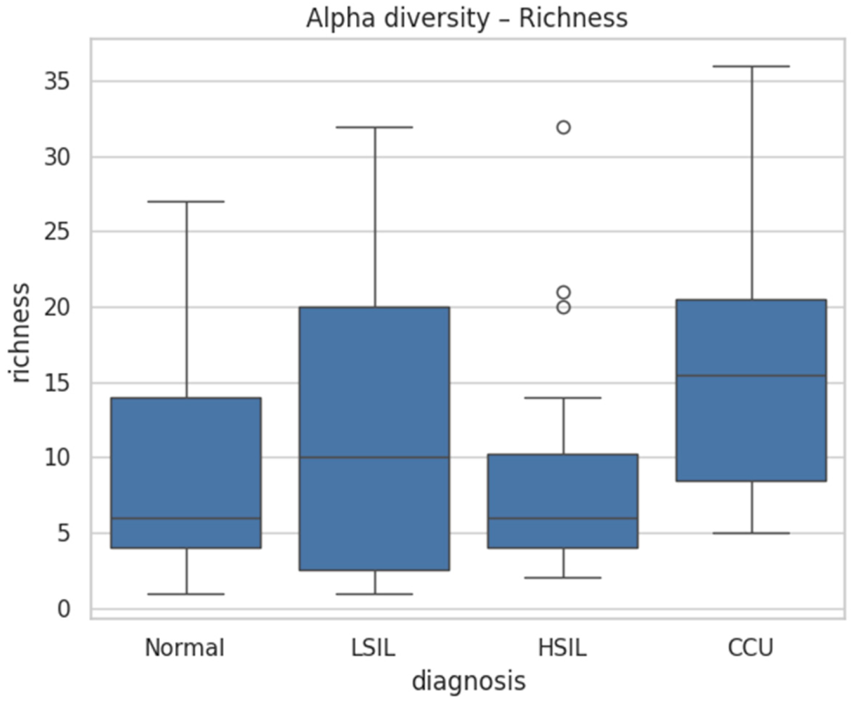 Cervicovaginal microbial communities exhibited a progressive restructuring across the spectrum of cervical disease. Normal samples displayed low richness (median 6.0, Q1–Q3 4.0–14.0) and Shannon diversity (median 0.08, Q1–Q3 0.01–0.45), reflecting low-complexity ecosystems (