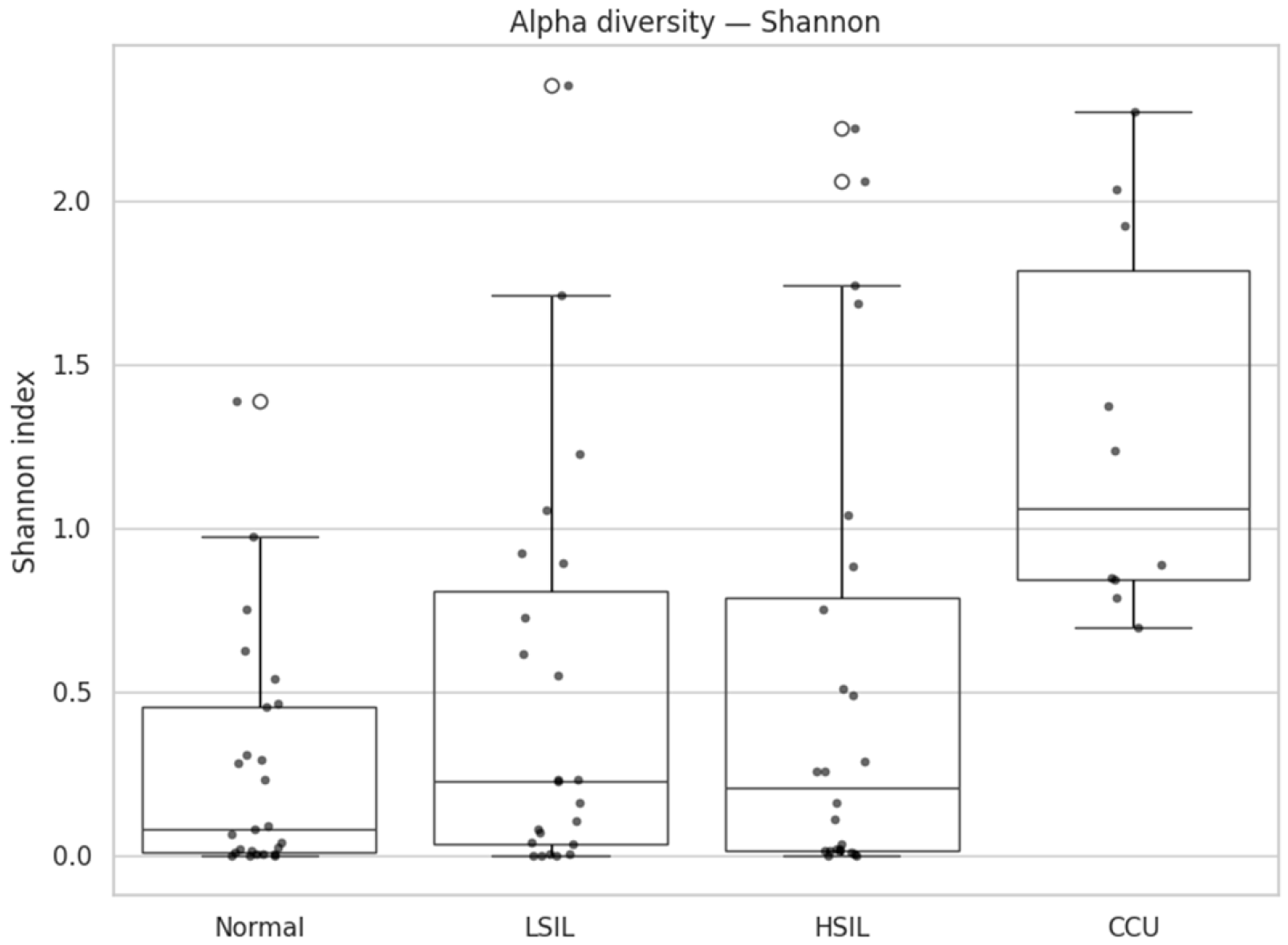 LSIL and HSIL samples showed intermediate diversity (LSIL richness 10.0 [2.5–20.0], Shannon 0.23 [0.03–0.81]; HSIL richness 6.0 [4.0–10.3], Shannon 0.21 [0.01–0.78]), indicating partial destabilization of these communities. Cervical cancer samples exhibited markedly higher richness (15.5 [8.5–20.5]) and Shannon index (1.06 [0.84–1.78]) (