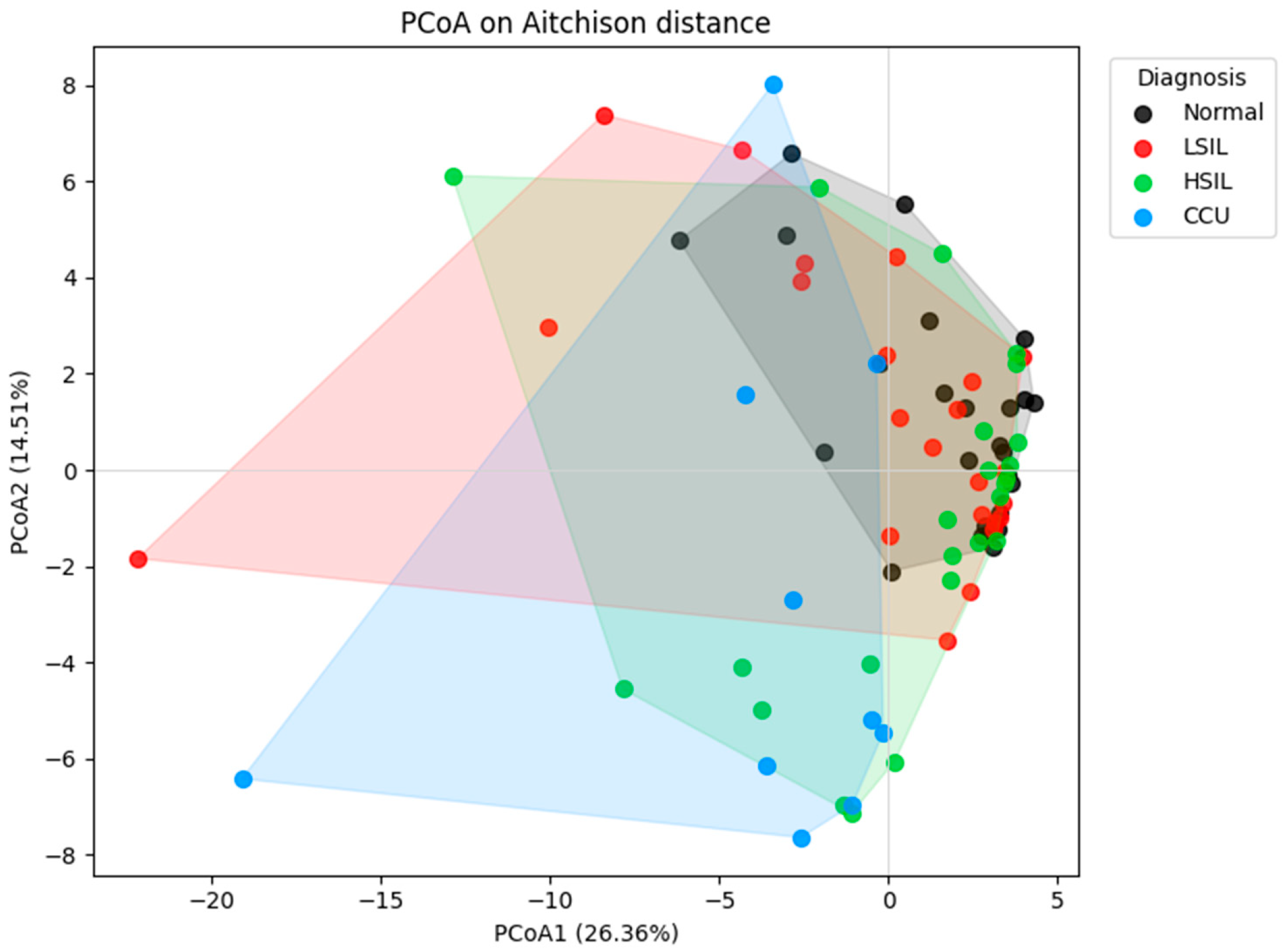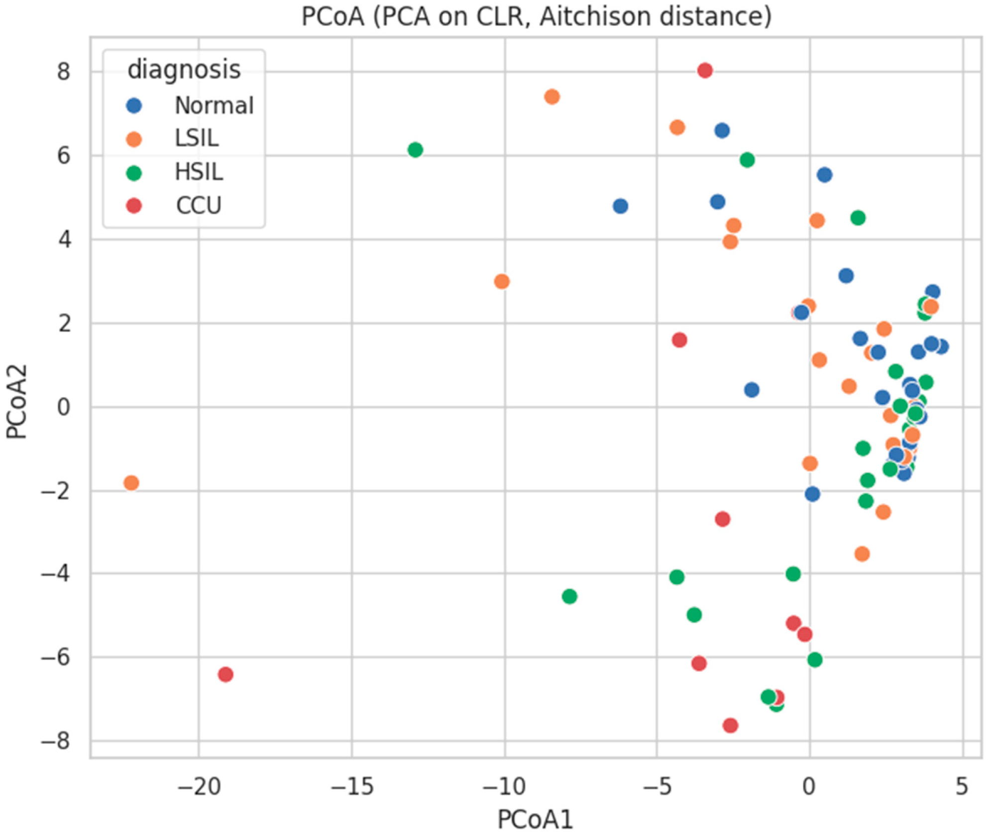 Multivariate analyses revealed that cervicovaginal microbial community composition diverges progressively across cervical disease severity. Global PERMANOVA based on Aitchison distances confirmed a strong effect of diagnosis on microbiome structure (pseudo-F = 2.43,