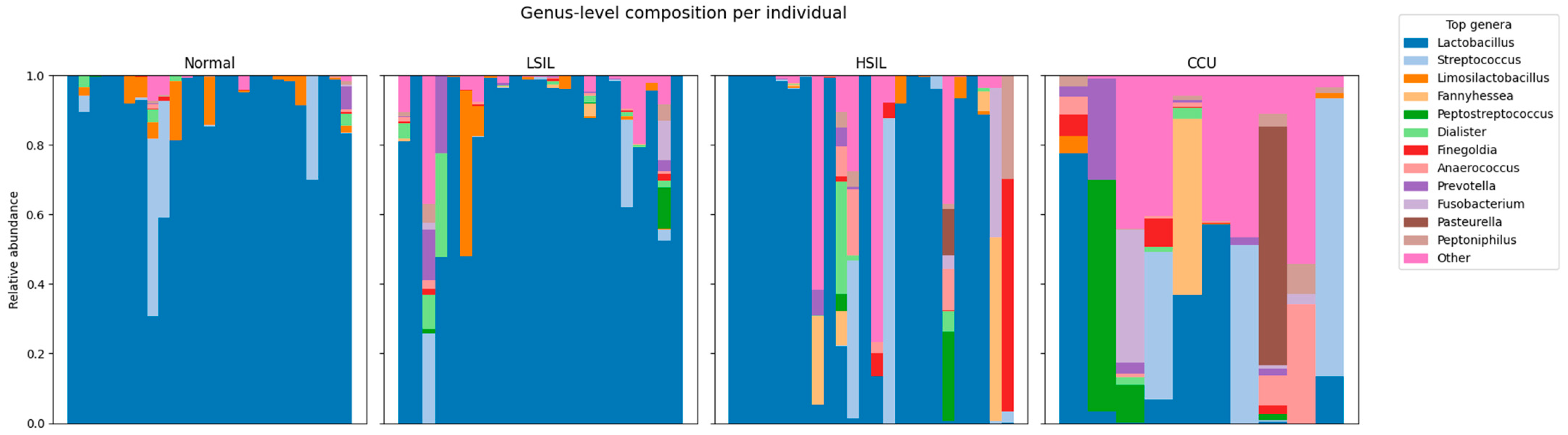 Individual-level stacked bar plots revealed marked shifts in the taxonomic structure of the cervicovaginal microbiome across diagnostic categories (