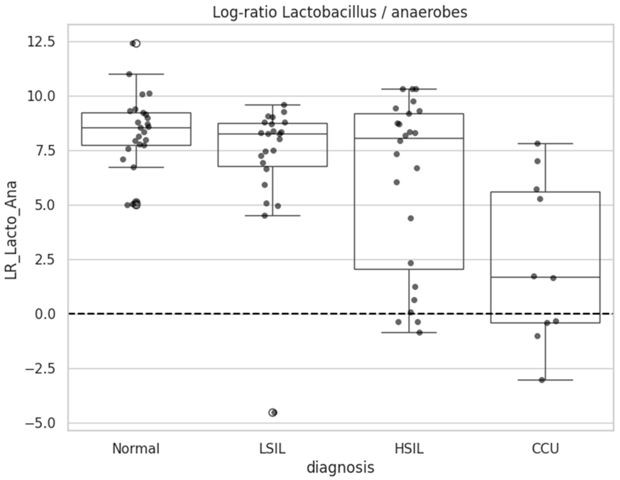 A key feature of disease progression identified in this study is the progressive loss of Lactobacillus dominance. While Lactobacillus remained prevalent in most non-cancer samples, its relative abundance declined in parallel with increasing lesion severity, accompanied by expansion of anaerobic taxa. Compositional log-ratio analyses, which are robust to the constraints of relative abundance data, revealed a strong monotonic decrease in the Lactobacillus-to-anaerobe ratio, with the most pronounced differences involving cervical cancer. These findings support the notion that imbalance between lactic acid-producing bacteria and anaerobic, pro-inflammatory taxa.