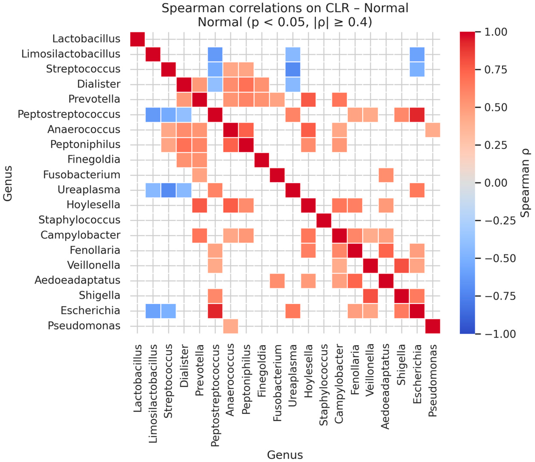 Genus–genus associations were estimated using Spearman rank correlations computed on CLR-transformed abundances. Correlations involving constant vectors or undefined coefficients were excluded.
