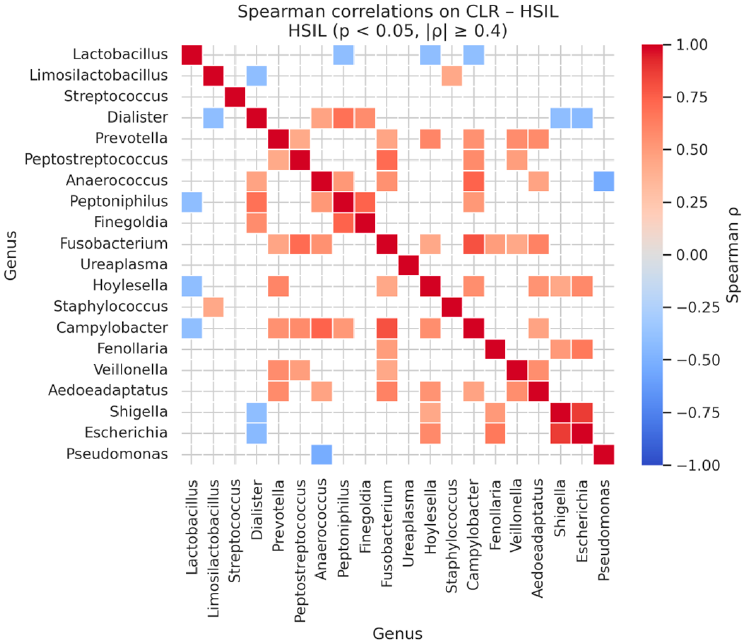 In contrast, the LSIL group exhibited a substantial increase in network complexity, with fifteen genera retained and three strong positive associations. Notably, Dialister emerged as a central node, showing significant correlations with both Anaerococcus (ρ = 0.708, q = 0.0084) and Prevotella (ρ = 0.689, q = 0.0098), while a strong association between Escherichia and Shigella (ρ = 0.776, q = 0.0014) indicated coordinated expansion of facultative pathobionts. Despite this increased connectivity, the LSIL network remained fragmented, with a low density (0.0286) and a high number of disconnected components (12 components), suggesting heterogeneous microbial configurations characteristic of an early dysbiotic transition rather than a fully consolidated community state.