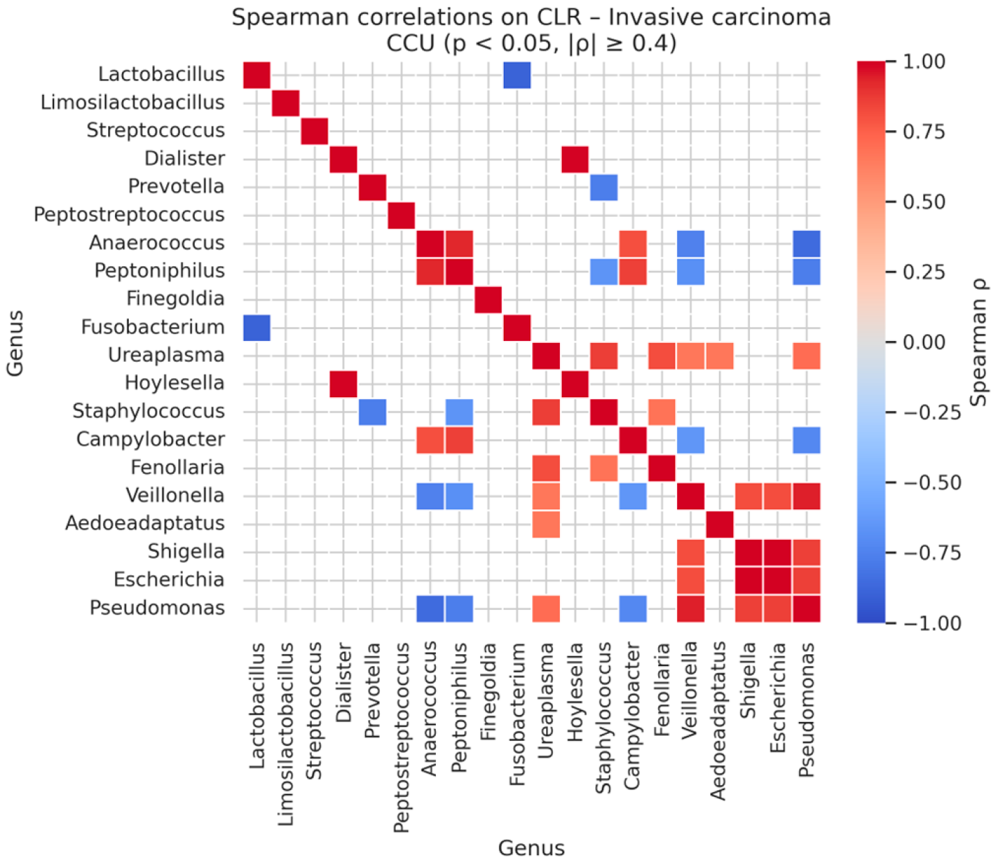 p < 0.01). These results indicate that advanced disease is associated with highly structured co-occurrence networks among anaerobic and facultative anaerobic genera, reflecting a more deterministic, polymicrobial community state in invasive carcinoma (