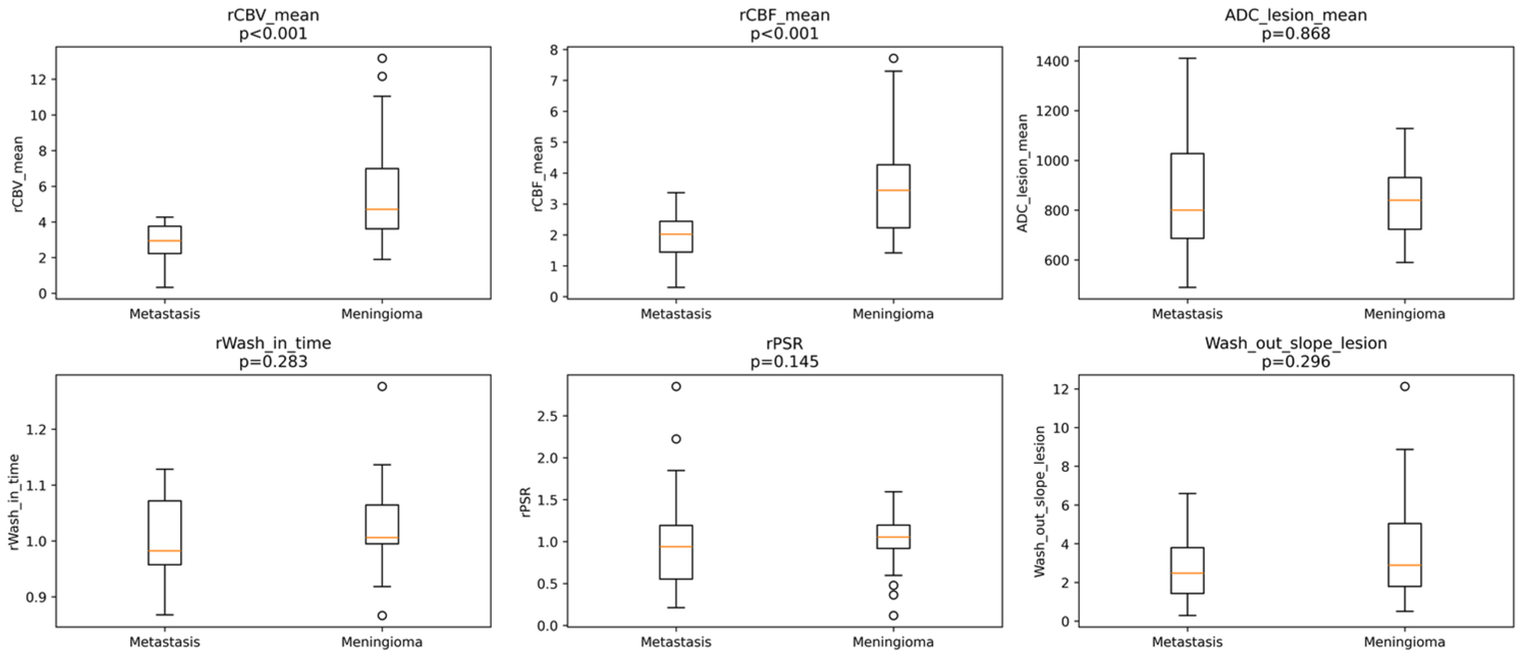 27]. These differences in vascular microenvironment likely explain the consistent elevation of rCBV and rCBF in meningiomas observed in our cohort.