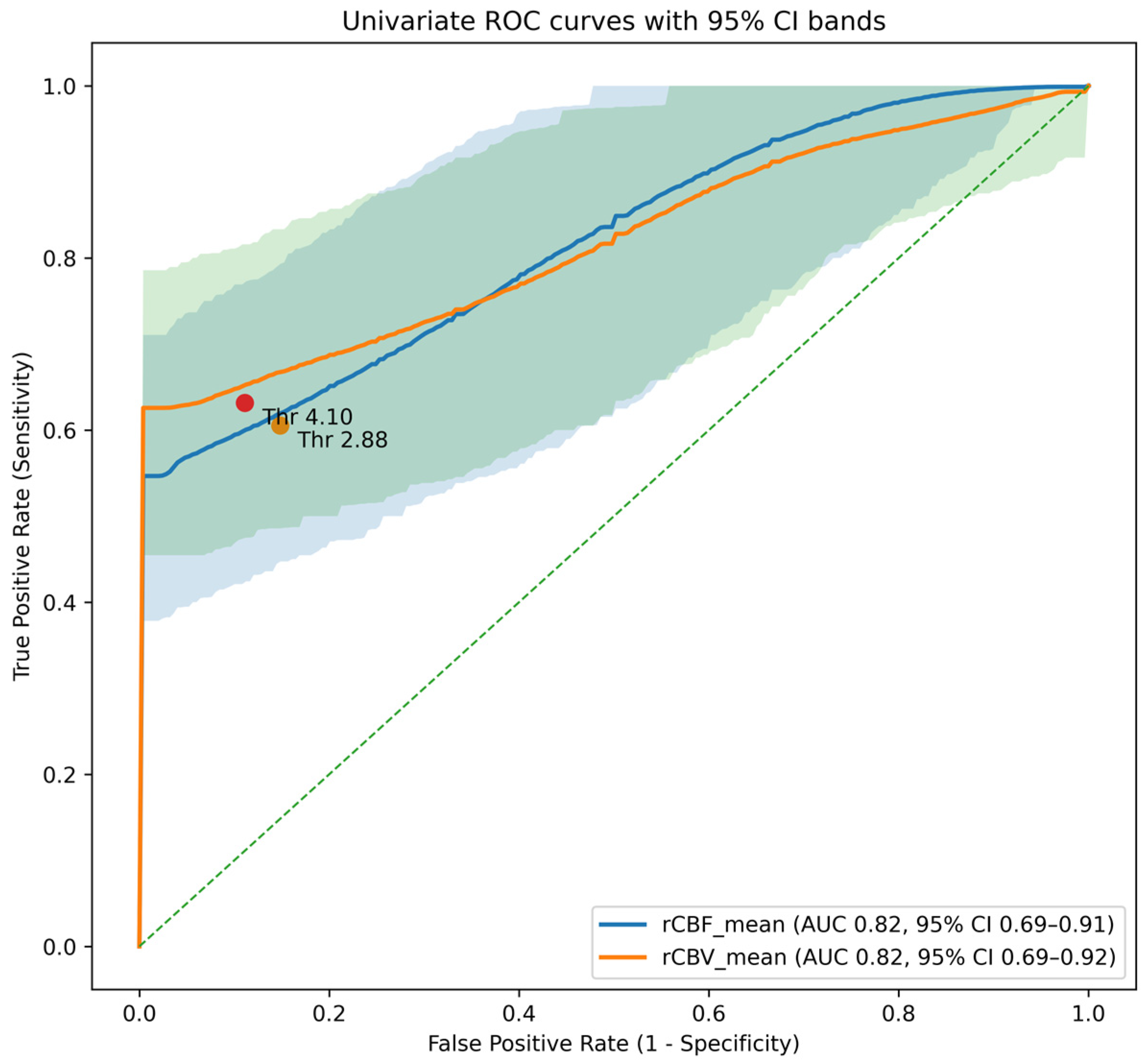 As a sensitivity analysis addressing, additional validation strategies were performed using the same two-feature set (rCBF_mean and rCBV_mean). Specifically, we implemented (i) grouped 10-fold nested cross-validation and (ii) leave-one-patient-out cross-validation (LOPO), ensuring that lesions from the same patient were never split across training and test sets. Hyperparameter tuning was conducted within inner grouped cross-validation loops in all settings to prevent data leakage.