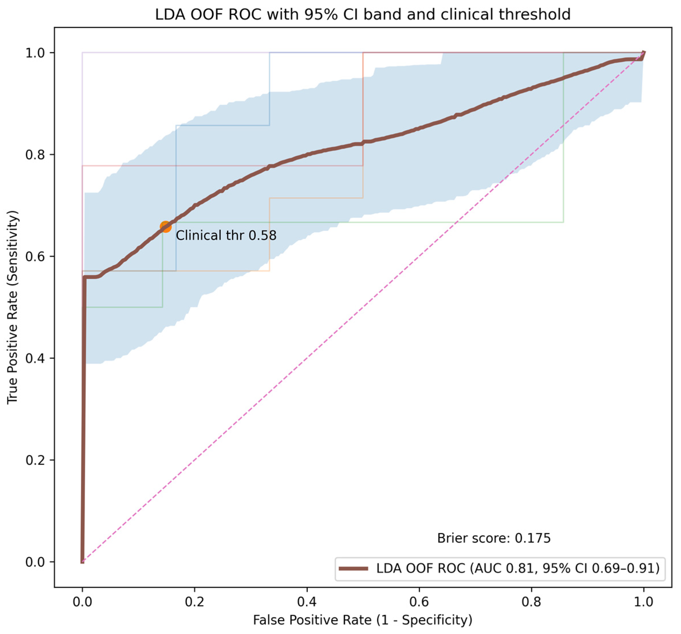 In addition to the initially tested linear models (LDA, L2-regularized logistic regression, and linear SVM), we evaluated a decision tree classifier and a k-nearest neighbors (KNN) model. Furthermore, a soft-voting ensemble combining the two best-performing base models (based on out-of-fold AUC) was implemented using averaged predicted probabilities. Model performance was assessed using pooled out-of-fold ROC–AUC, Brier score, and threshold-based clinical metrics. Machine learning analyses were implemented using Python (version 3.11.5) with scikit-learn and Optuna libraries.