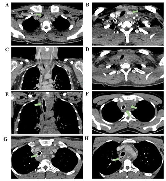 Pre-treatment imaging: CT reveals an anterior superior mediastinal mass (measuring approximately 3.9 × 2.3 cm) with the following features: (A) tracheal compression, (B) compression of the left thyroid lobe, (C) heterogeneous enhancement of the mass in the venous phase coronal section, and (D) axial plain CT scan shows no cystic changes within the lesion. Post tracheal stent placement: (E) CT coronal section demonstrates stent placement within the trachea. (F) Mass shows scattered cystic changes within its parenchyma. Two months post-treatment: (G) Mass demonstrates significant enlargement, measuring approximately 5.5 × 2.7 cm, with intraluminal granulation tissue hyperplasia observed within the tracheal stent. (H) Esophageal compression evident (M: mass).