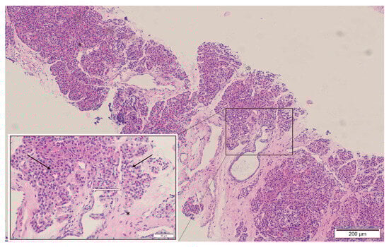 Histopathological examination of the mediastinal mass biopsy (H&E stain): The specimen reveals pancreatic acinar structures with a lobular arrangement (black arrows), composed of tightly packed basophilic acinar cells with benign morphology. Scattered pancreatic duct-like structures are present (white arrows). The epithelial components are embedded in dense fibrous connective tissue exhibiting hyaline degeneration (asterisk). These findings are consistent with benign ectopic pancreatic tissue; no evidence of malignancy or lymphoma infiltration is identified.