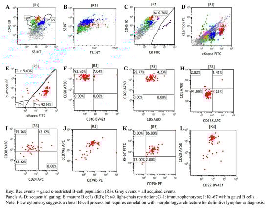- Kussick, S.J.; Kalnoski, M.; Braziel, R.M.; Wood, B.L. Prominent clonal B-cell populations identified by flow cytometry in histologically reactive lymphoid proliferations. Am. J. Clin. Pathol. 2004, 121, 464–472. [Google Scholar] [CrossRef]