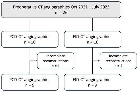 Of the 26 patients examined during the study period, 8 were excluded due to incomplete reconstructions (PCD-CT: n = 1; EID-CT: n = 7). Half of the patients underwent a PCD-CTA examination (mean age: 64 ± 6 years; two females), and the other half underwent an EID-CTA (mean age: 63 ± 5 years; four females).