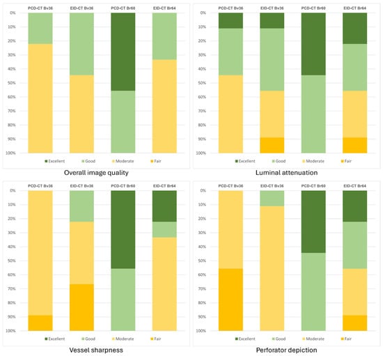 Yalon et al. demonstrated, based on a study population of 52 patients, that PCD-CT facilitates the identification of fibular perforator arteries, with an increase of up to 50% in identified arteries, while concomitantly reducing the required contrast agent dose by half, but in contrast, increasing the radiation dose by approximately 40%. The scan protocols and reconstructions employed in this study distinctly differentiate between PCD-CT and EID-CT. This is evidenced by the utilization of an ultra-high-resolution mode for PCD-CT in lieu of standard resolution, the employment of disparate reconstruction kernels, or the differentiation of the pixel matrix [48]. Consequently, a limited degree of comparison can be made between the two subgroups. Therefore, the objective of our study was to select parameters that were as similar as possible in order to reduce this bias.