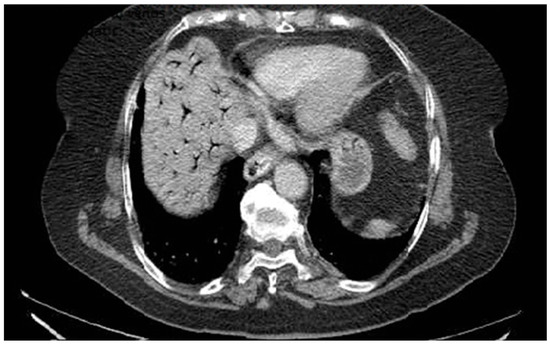 Thrombophilia encompasses a heterogeneous group of disorders characterized by an imbalance in the regulation of coagulation and fibrinolysis, leading to an increased tendency for thrombosis [76]. The risk of developing thrombophilia is related to both inherited and environmental factors [76]. Systemic congenital and acquired thrombophilia, such as Factor V Leiden mutation, antithrombin III deficiency and prothrombin G20210A mutation, have been reported in patients with portal vein thrombosis. Although individually uncommon, these inherited prothrombotic conditions can significantly contribute to the overall thrombotic risk, particularly in patients with non-cirrhotic portal vein thrombosis [1,38,77]. Regarding protein C and protein S deficiencies, evidence regarding their thrombophilic role remains inconclusive, largely because many studies included patients with chronic liver disease and the levels of these natural anticoagulants can be influenced by anticoagulant therapy or by the acute thrombotic event itself [38]. Prothrombin G20210A and Factor V Leiden mutation have been associated with an increased risk of portal vein thrombosis in patients with cirrhosis [78,79]. Patients with cirrhosis who carry these inherited thrombophilic mutations have approximately a two fold higher risk of developing PVT compared to those without such mutations [78]. Overall, the prevalence of both acquired and inherited thrombophilia in cirrhotic patients with PVT appears low, supporting targeted, individualized testing rather than universal screening [78,79]. The following case illustrates the clinical impact of thrombophilia-associated portal vein thrombosis in a patient with underlying cirrhosis and Factor V Leiden mutation, highlighting how inherited prothrombotic conditions can lead to severe complications such as hepatic infarction.