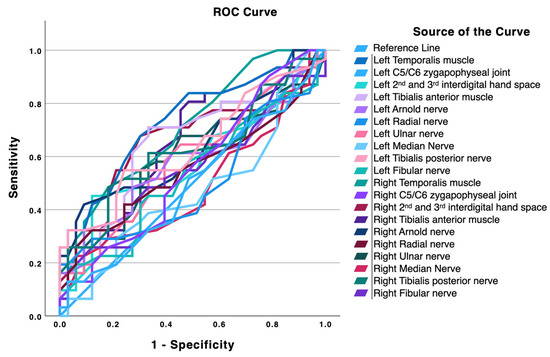 Some variables changed more noticeably in terms of the selected cut-off and/or diagnostic profile (e.g., left C5/C6 zygapophyseal joint, left ulnar nerve, left median nerve, left fibular nerve, right radial nerve, and right tibialis anterior muscle), but most of these sites remained in the low-discrimination range and were not statistically significant. As in the main analysis, several apparently high LR+ values in Table 3 occurred at sites with poor overall AUCs and non-significant ROC curves, likely reflecting low false-positive rates at the chosen cut-offs, and therefore should be interpreted cautiously.
