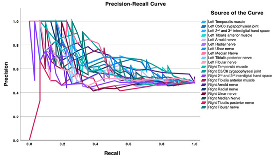 PR plots for the temporalis and tibialis anterior muscles support their potential utility as supportive/complementary markers, particularly because they maintained comparatively higher precision across moderate recall ranges, despite only modest likelihood ratios and below-threshold AUCs at the tibialis anterior sites.