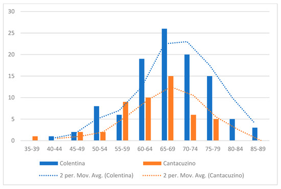 “Colentina” patients were slightly older (mean 67.4 ± 9.0 vs. 64.0 ± 8.2 years, p ≈ 0.021) (Figure 2) and had more laparoscopic procedures (38.5% vs. 6.1% laparoscopic, p < 0.001). “Dr. I. Cantacuzino” patients more often received neoadjuvant therapy (chemotherapy: 33% vs. 15%, p ≈ 0.025; radiotherapy: 40.8% vs. 15.4%, p ≈ 0.001).