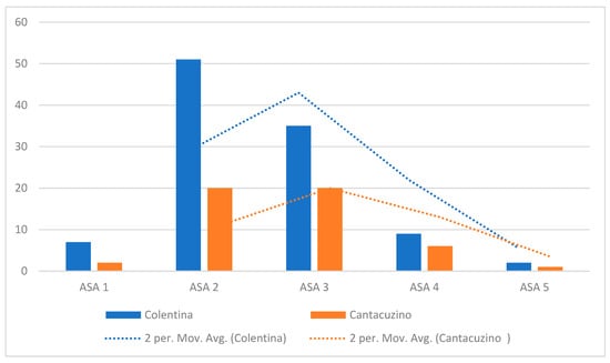 The “Colentina” center’s case mix is skewed toward lower-risk patients, with the majority of cases classified as ASA I–II (Figure 4). Specifically, ASA I and II collectively account for nearly 70% of the “Colentina” cohort. In contrast, “Dr. I. Cantacuzino” presents a more even distribution across ASA classes I–III, with notably higher proportions of ASA III patients and a small but visible representation of ASA IV. ASA V appears rarely in either group but is not absent.