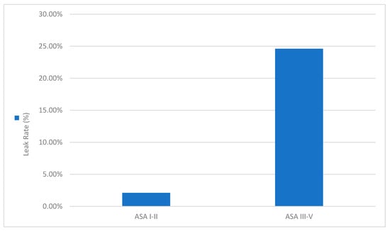 Figure 5 depicts the sharp contrast in leak incidence by ASA class, reaffirming previous findings that high ASA status correlates with poor healing capacity. Higher ASA status (III–V) was associated with significantly greater AL incidence (~24.6%) as compared to ASA I–II (~2.1%).
