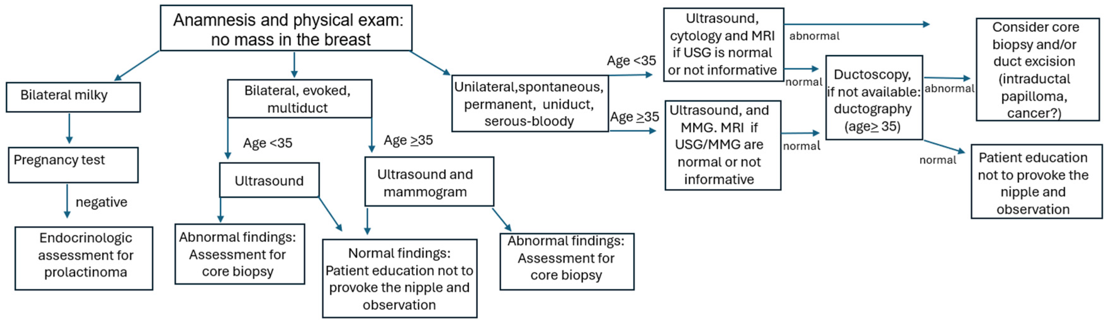 - Patel, B.K.; Falcon, S.; Drukteinis, J. Management of nipple discharge and the associated imaging findings. Am. J. Med. 2015, 128, 353–360. [Google Scholar] [CrossRef]
