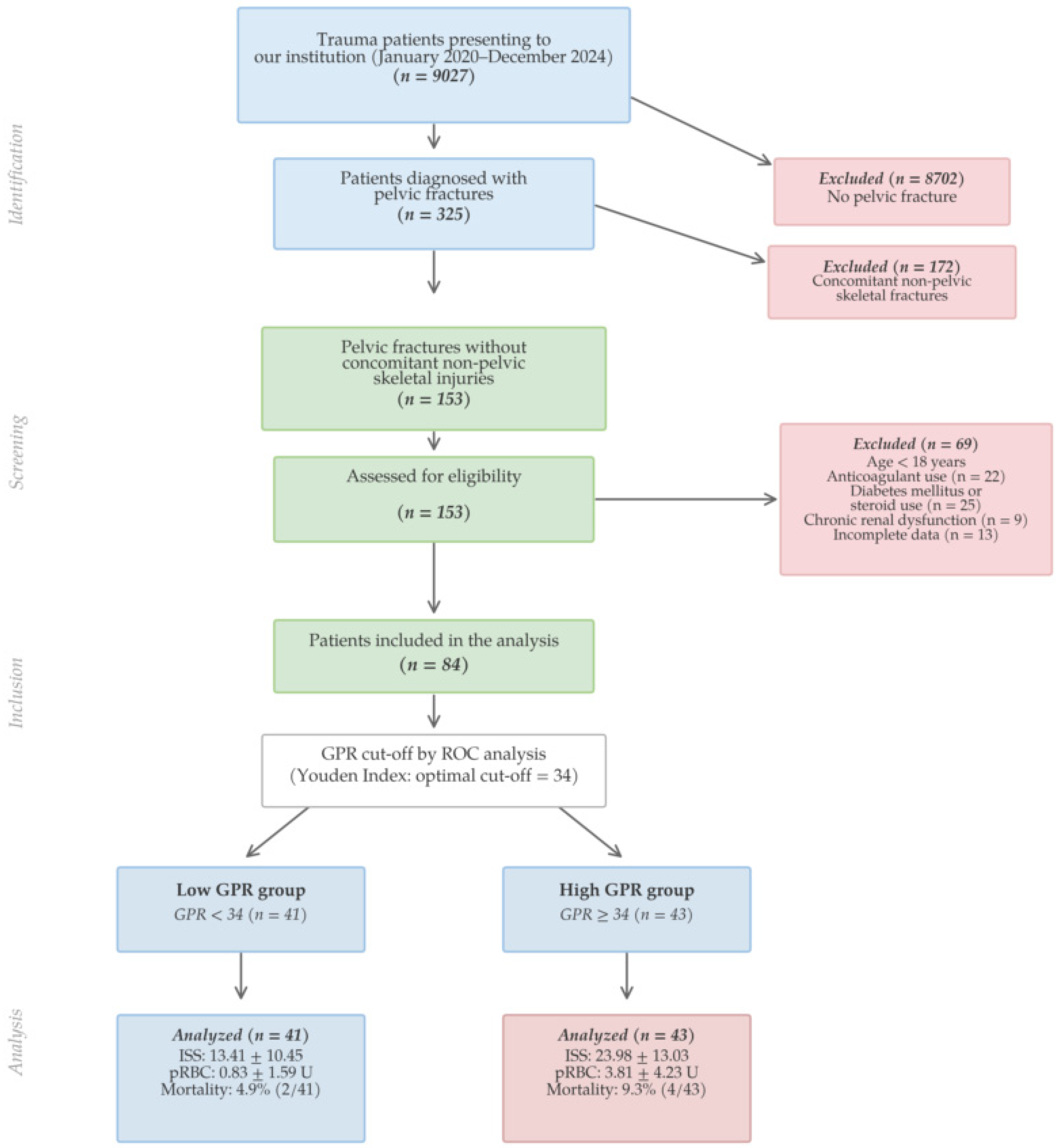 Chicago/Turabian StyleSahin, Abdullah Alper, Yunus Emre Özbilen, and Çağrı Akalın. 2026. "Association of Serum Glucose/Potassium Ratio with Injury Severity and Transfusion Requirements in Traumatic Pelvic Fractures: A Retrospective Cohort Study" Diagnostics 16, no. 6: 939. https://doi.org/10.3390/diagnostics16060939