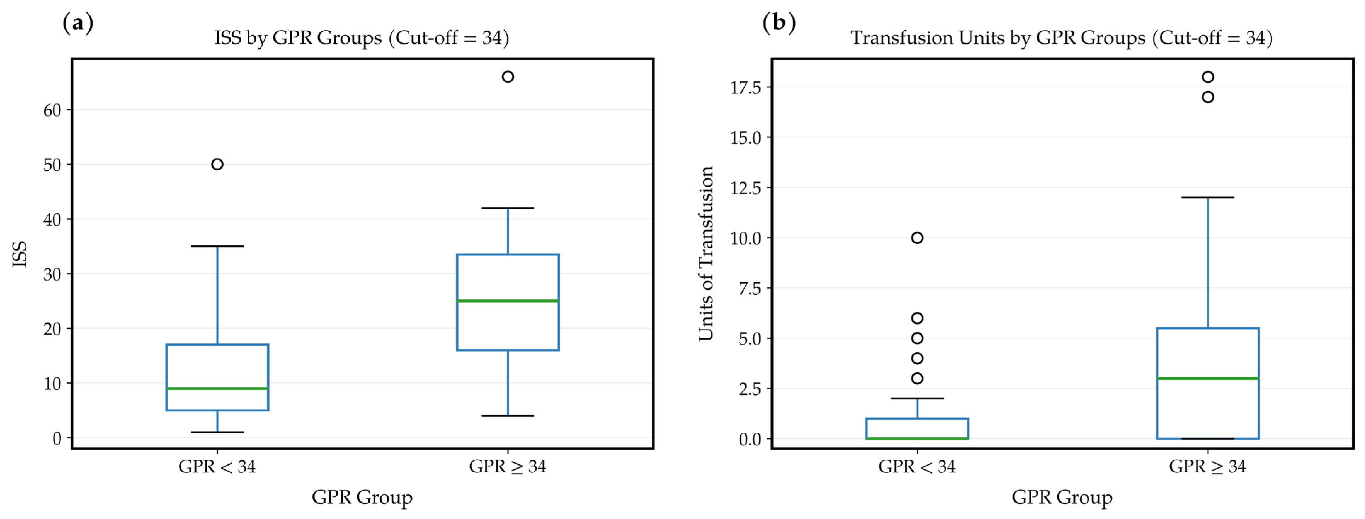 | Low GPR (<34), n = 41 | High GPR (≥34), n = 43 | p Value | |