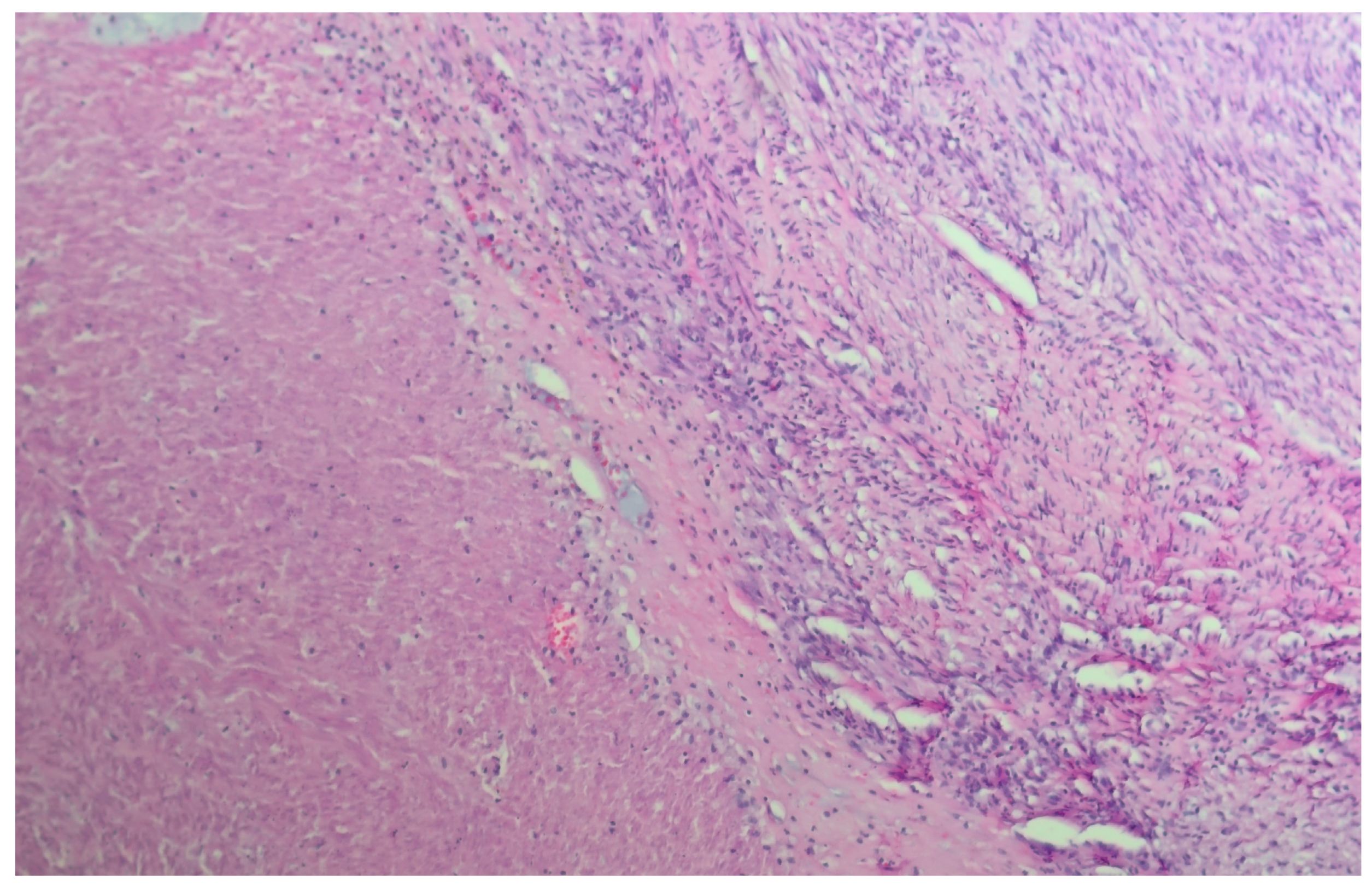 - Jovanovic, L.; Milenkovic, S.; Janjic, T.; Andric, L.; Sosic-Jurjevic, B.; Dokic, M. Myxoid pattern in smooth muscle tumor of uncertain malignant potential (STUMP) is a significant prognostic parameter with difficult diagnostic dilemmas. Eur. J. Gynaecol. Oncol. 2025, 46, 66–71. [Google Scholar] [CrossRef]
