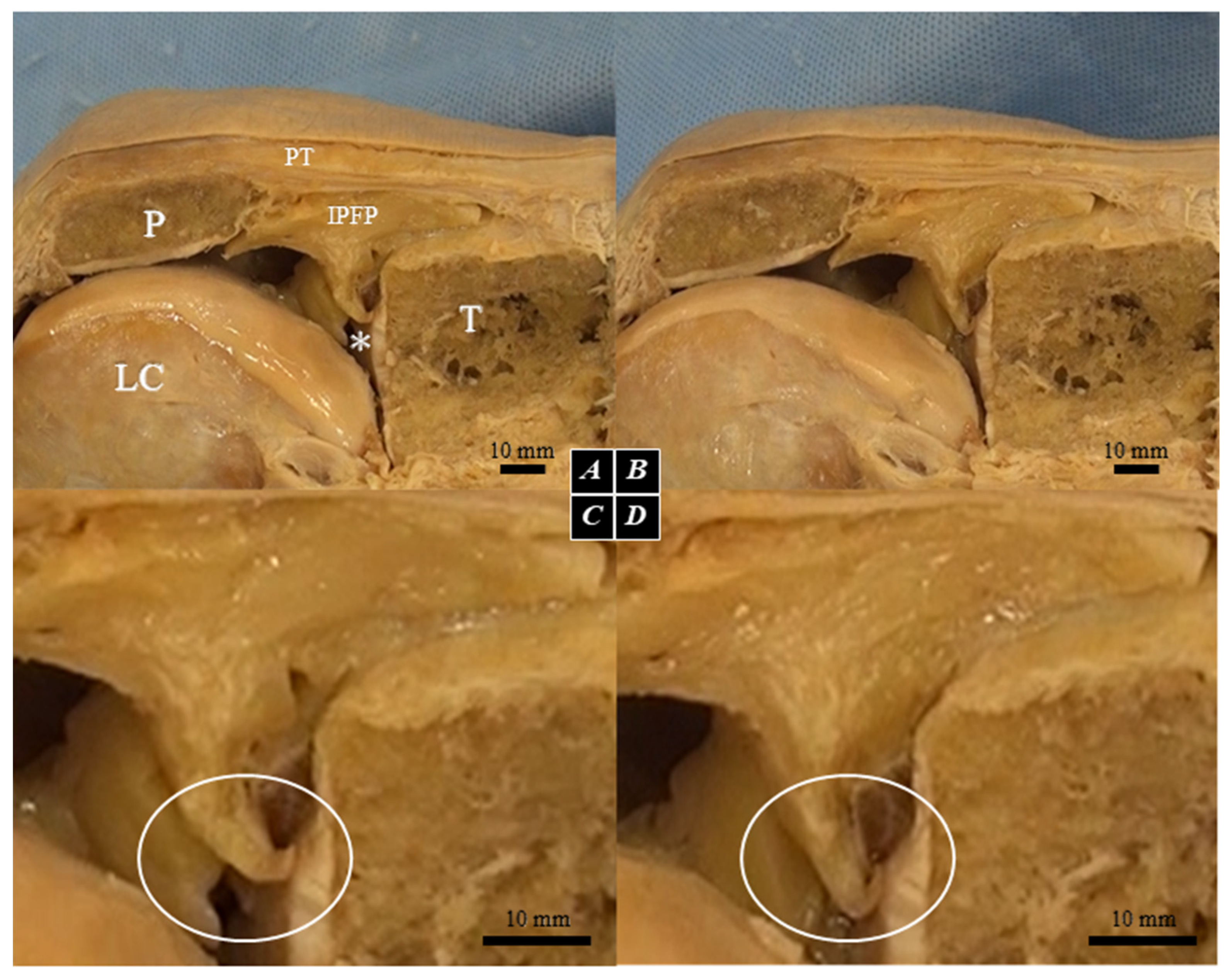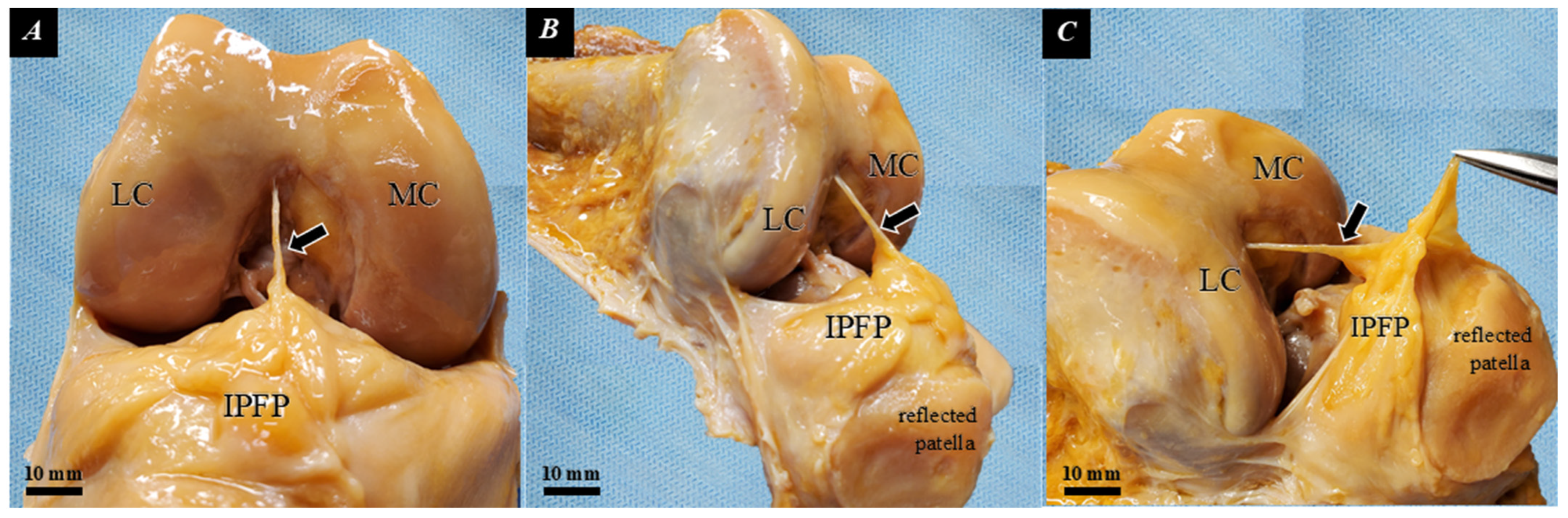 - Gallagher, J.; Tierney, P.; Murray, P.; O’Brien, M. The infrapatellar fat pad: Anatomy and clinical correlations. Knee Surg. Sports Traumatol. Arthrosc. 2005, 13, 268–272. [Google Scholar] [CrossRef] [PubMed]