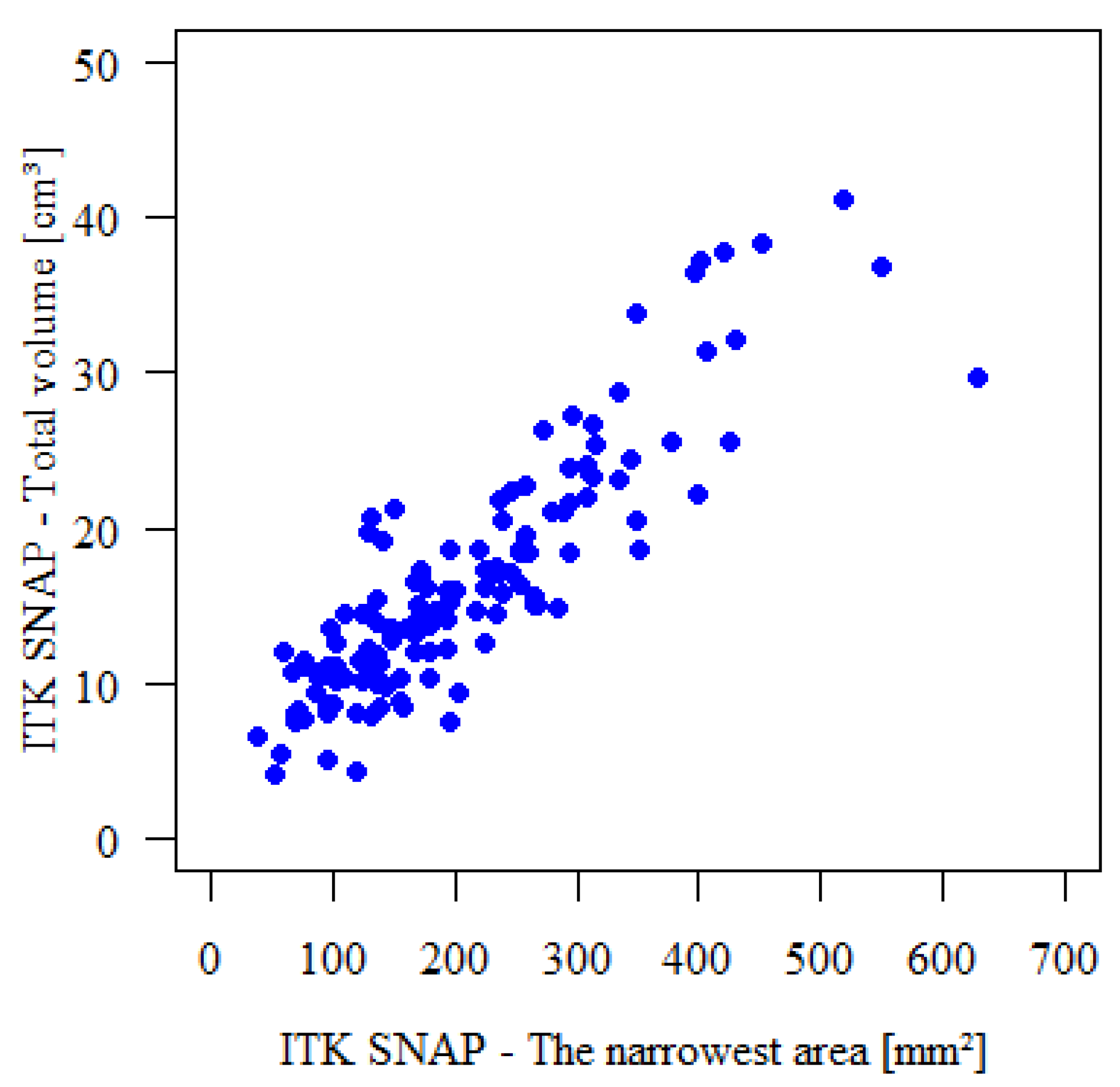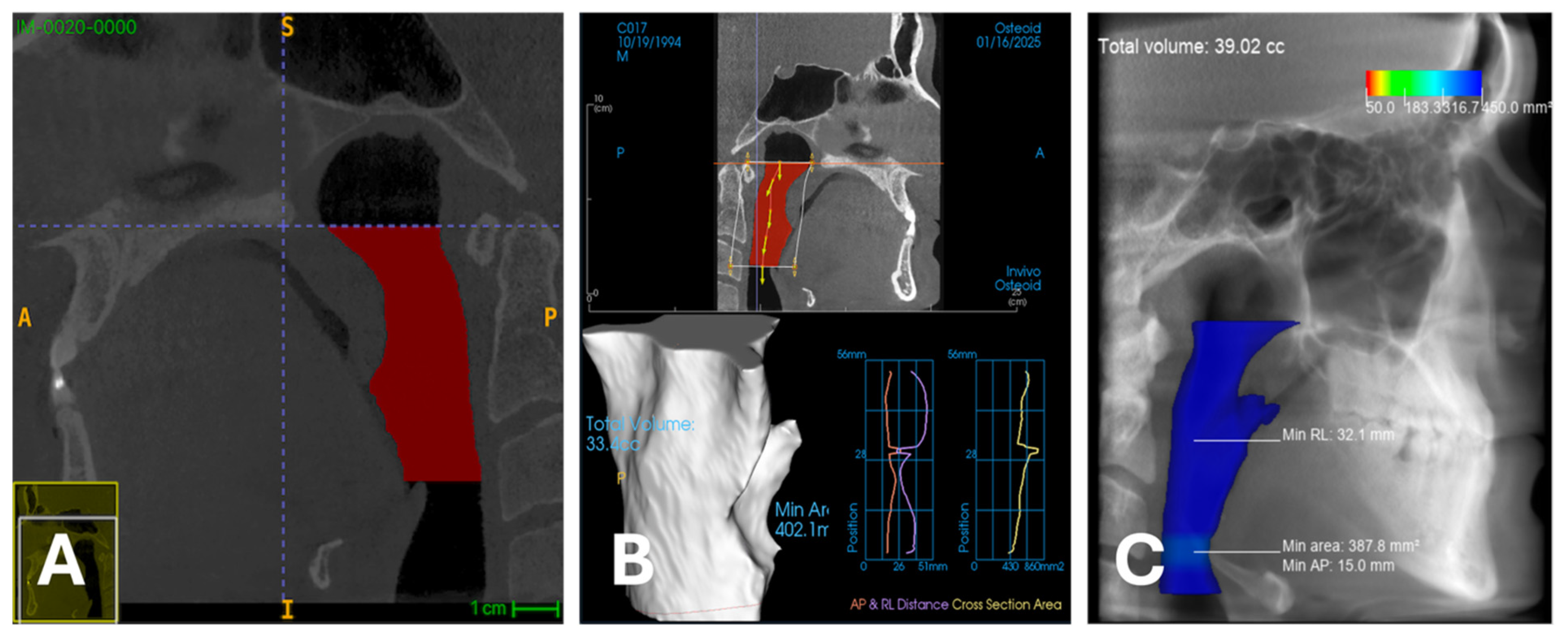 Figure 4). The parameter was always calculated via both CephX (AI-based) and Invivo 7 software. When the statistical data were analyzed, the results were almost identical to the manual measurements performed by both readers. This is a major advantage of both programs because, to identify and measure it manually, it is necessary to analyze the entire length of the airways and compare the surface areas of several places, selecting the narrowest one. Manual volumetry is both time-consuming and prone to errors. The time efficiency of AI-automated analysis offers a notable advantage, as the average duration required for manual volumetry―approximately 336.6 s―is nearly eleven times longer than that for AI-automated methods, which typically require fewer than 30 s.