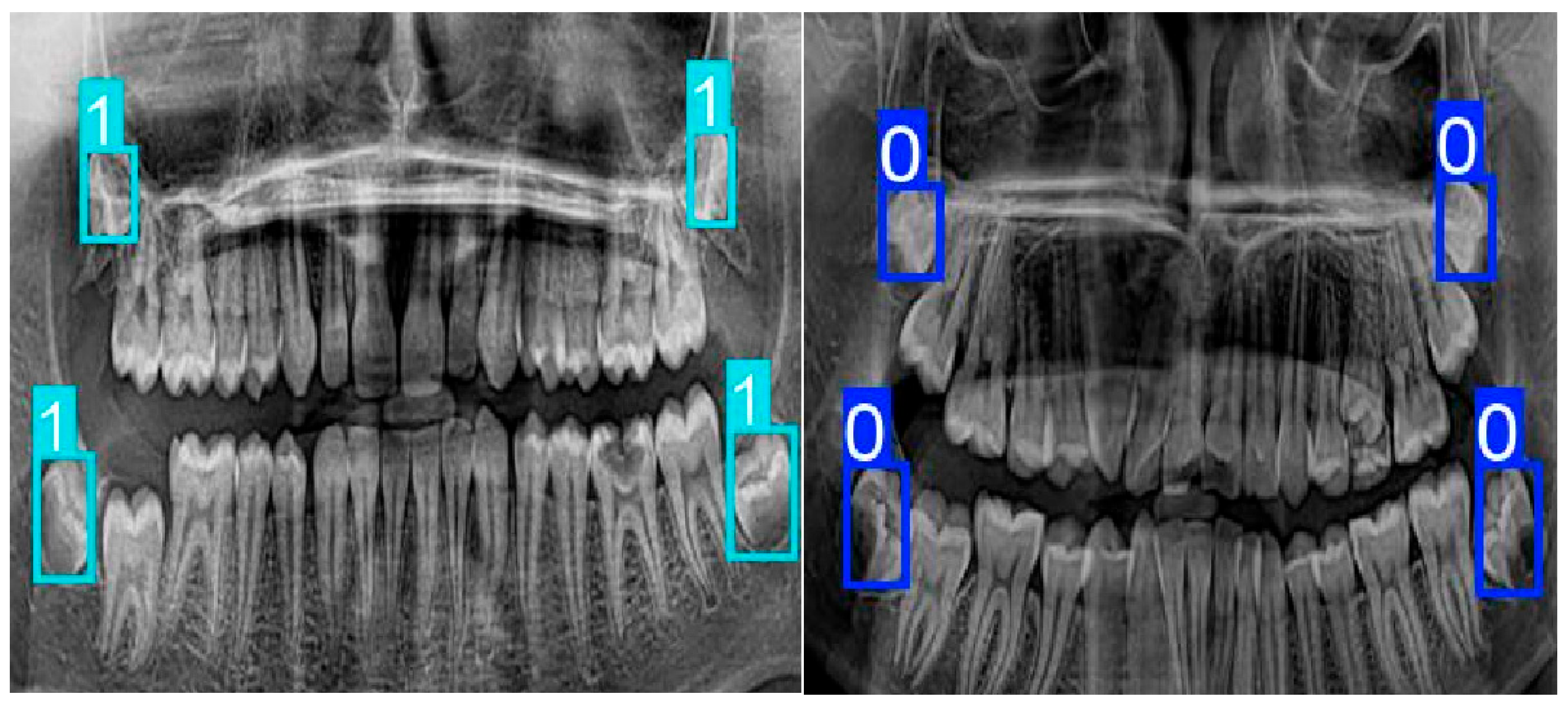 - Guldiken, I.N.; Tekin, A.; Kanbak, T.; Kahraman, E.N.; Özcan, M. Prognostic Evaluation of Lower Third Molar Eruption Status from Panoramic Radiographs Using Artificial Intelligence-Supported Machine and Deep Learning Models. Bioengineering 2025, 12, 1176. [Google Scholar] [CrossRef]