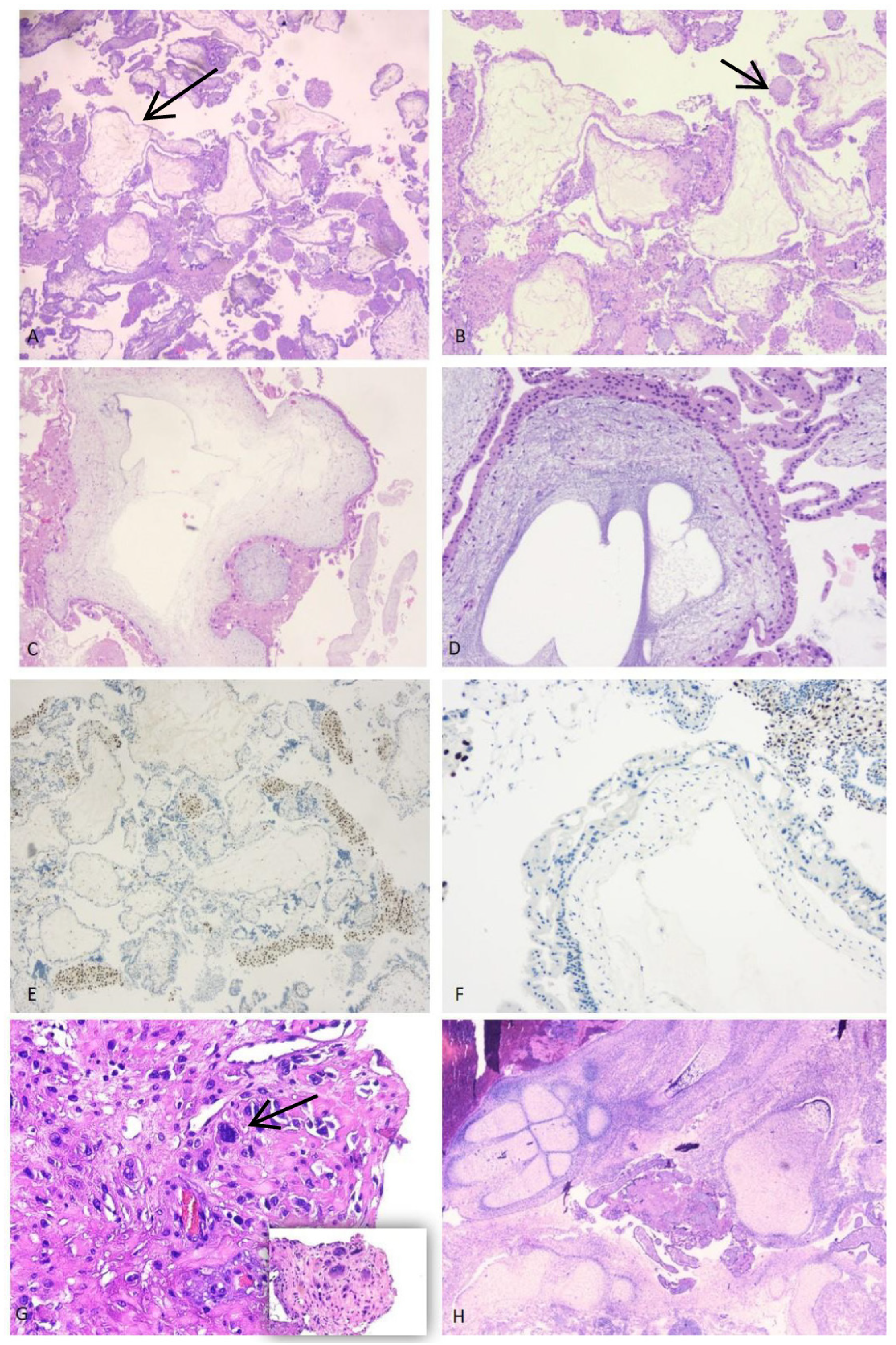 - Giacometti, C.; Bellan, E.; Ambrosi, A.; Dei Tos, A.P.; Cassaro, M.; Ludwig, K. “While there is p57, there is hope.” The past and the present of diagnosis in first trimester abortions: Diagnostic dilemmas and algorithmic approaches. A review. Placenta 2021, 116, 31–37. [Google Scholar] [CrossRef]