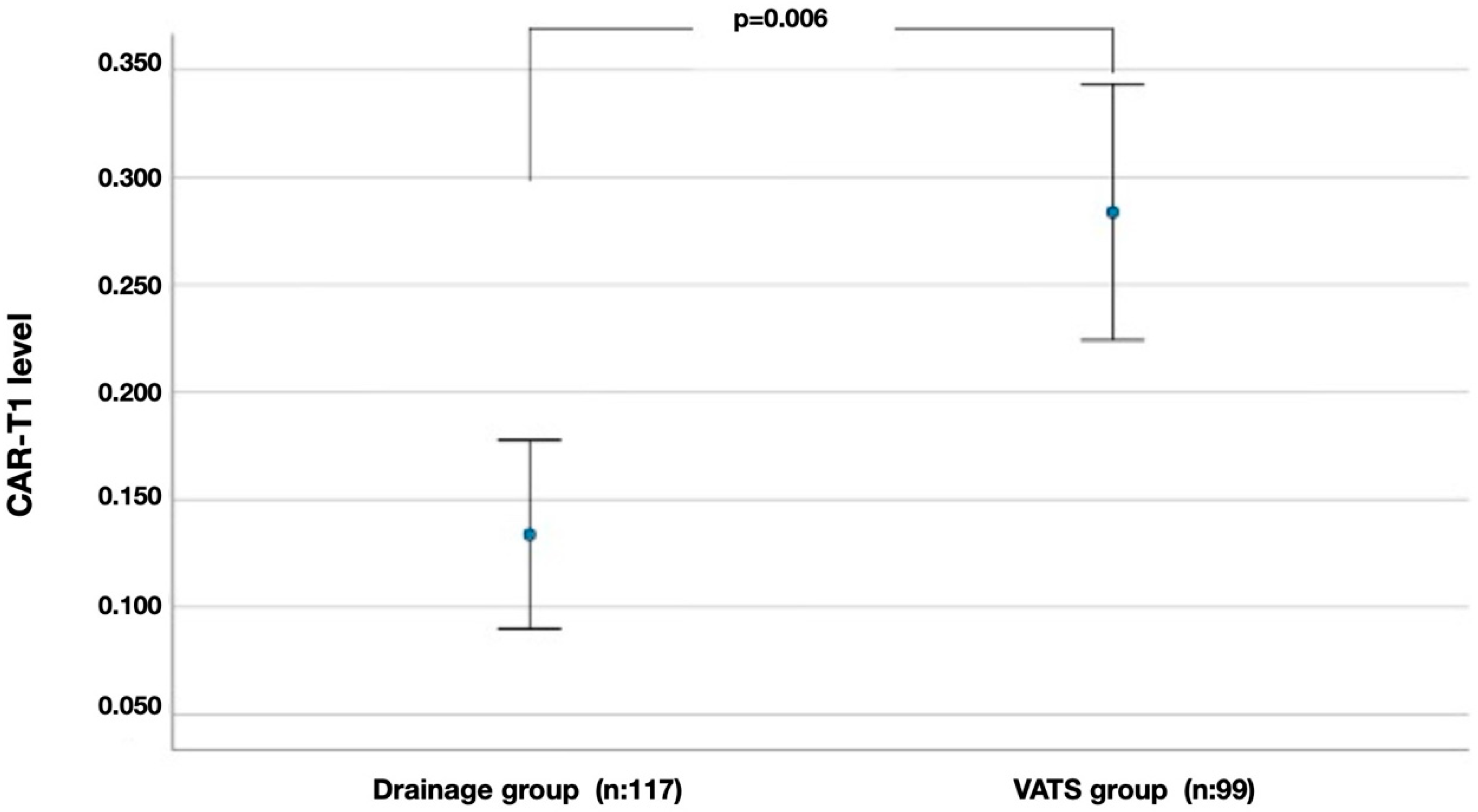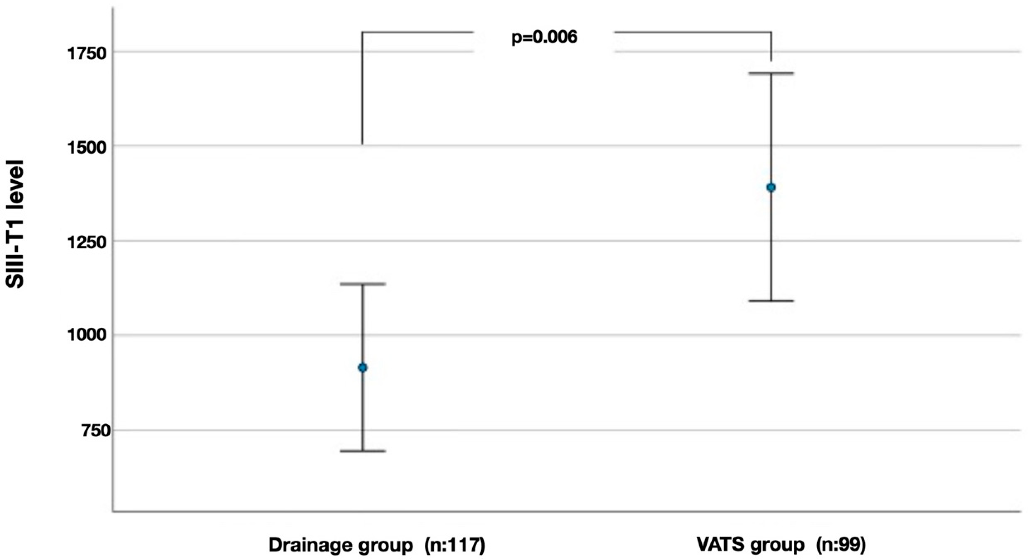 In the VATS group, the follow-up blood sample at T1, obtained on day 7 prior to the surgical decision;
