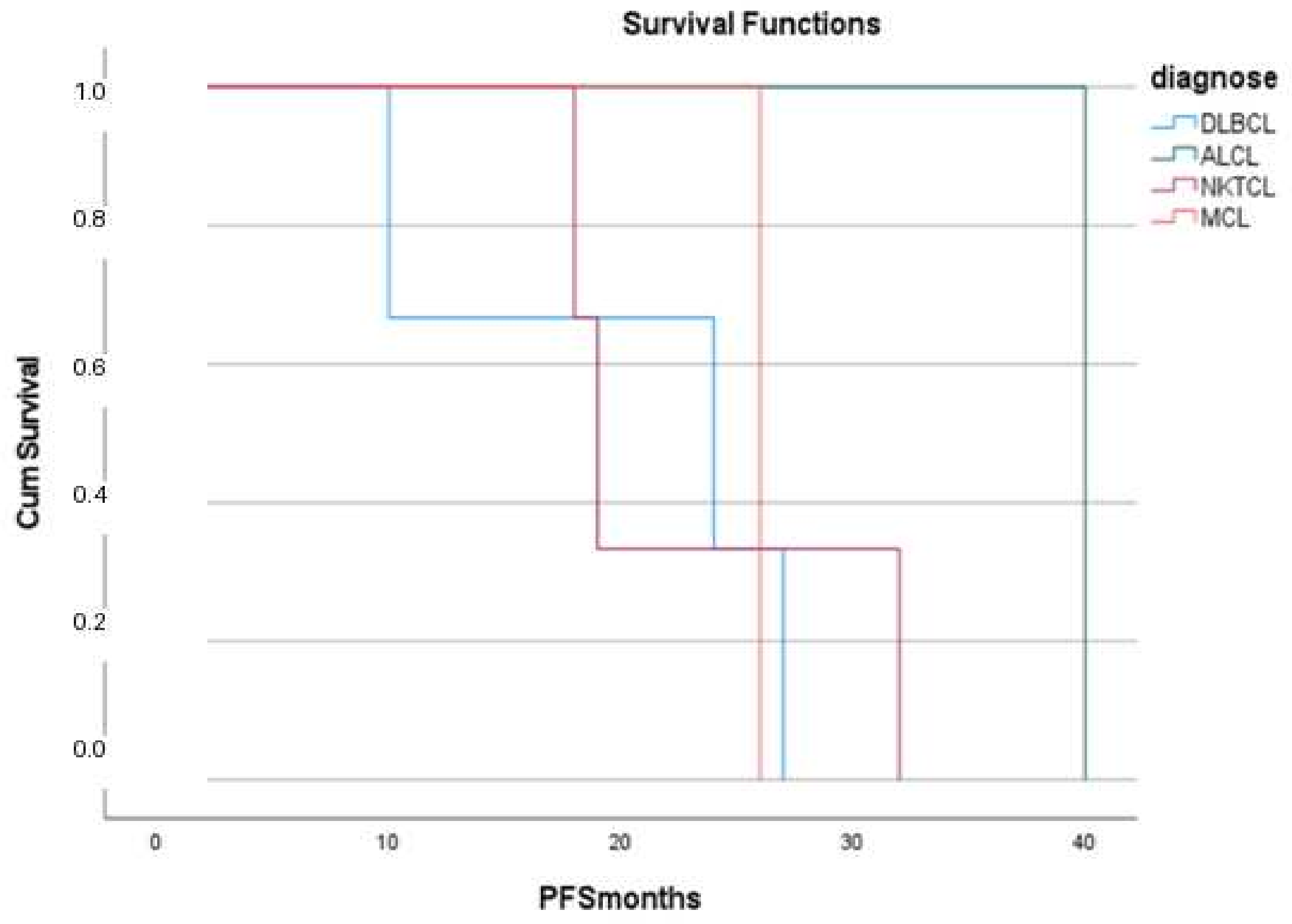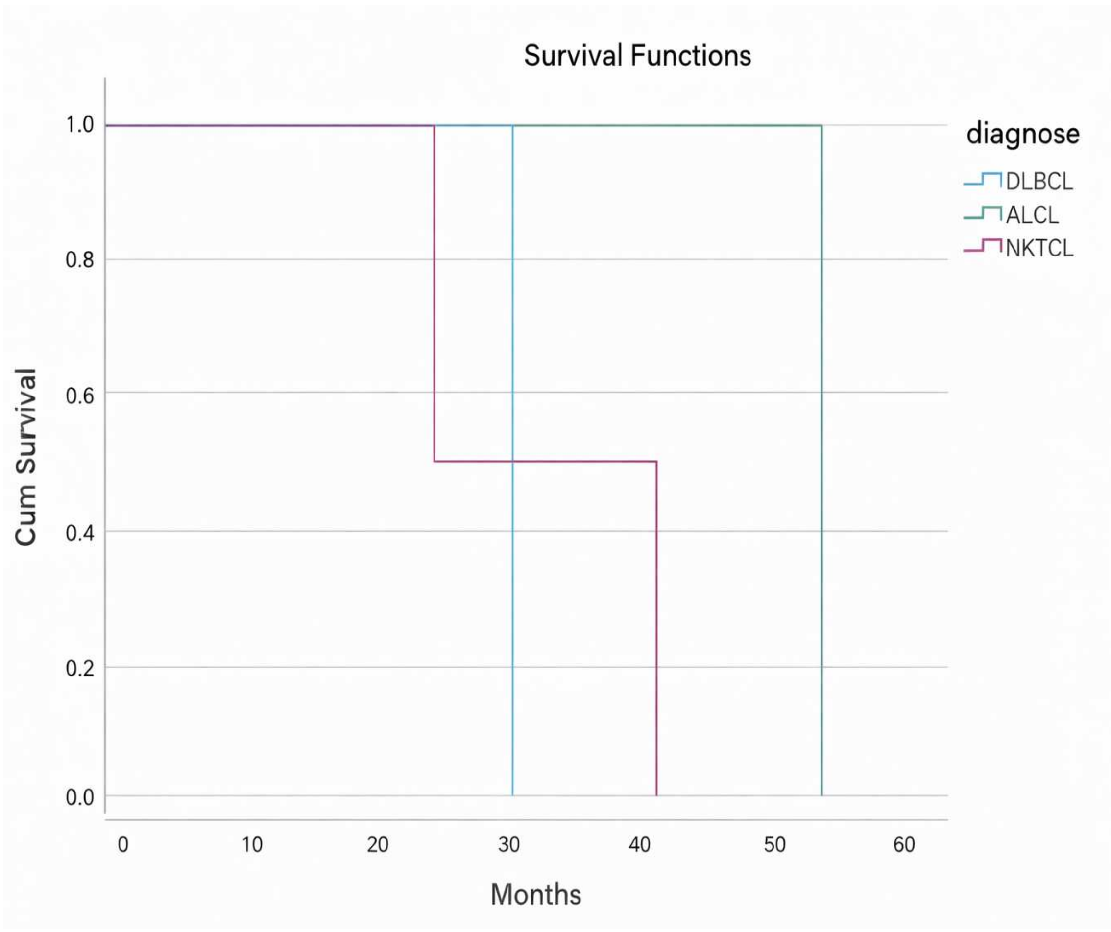Kaplan–Meier survival analyses were performed for the cohort. No statistically significant differences were observed between lymphoma subtypes or tumor sites. Due to the small sample size and heterogeneity of the cases, all analyses are presented for exploratory purposes only and should not be interpreted as evidence of prognostic differences.