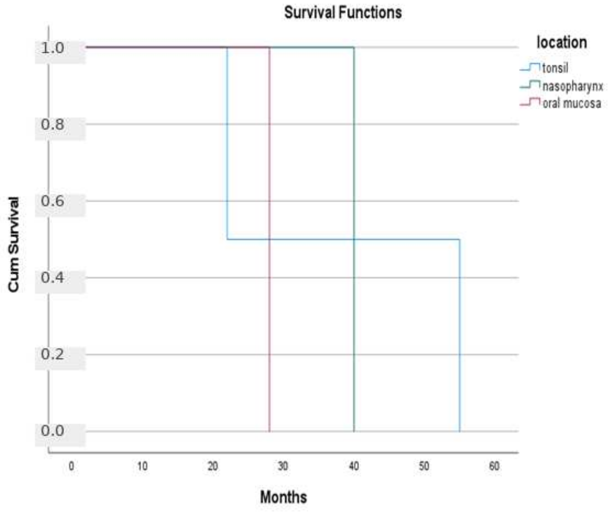 Figure 5). Similarly, when survival was analyzed according to tumor location (tonsil, nasopharynx, and oral mucosa), no significant impact on survival was found (