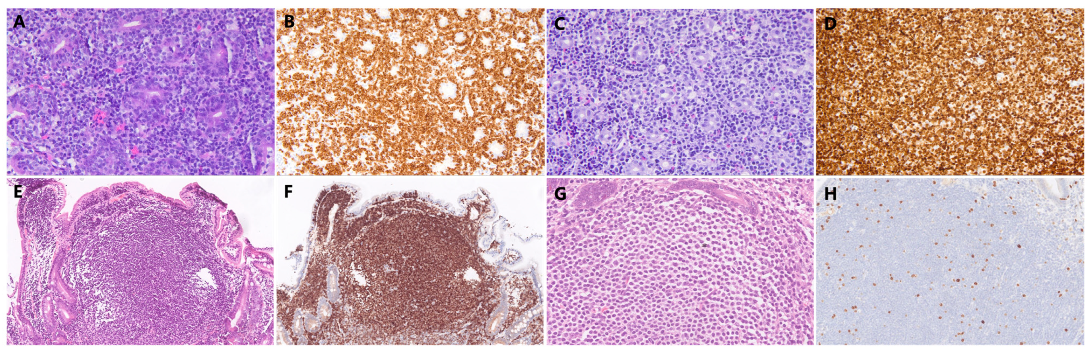 - Small, S.; Barnea Slonim, L.; Williams, C.; Karmali, R. B Cell Lymphomas of the GI Tract. Curr. Gastroenterol. Rep. 2021, 23, 9. [Google Scholar] [CrossRef]