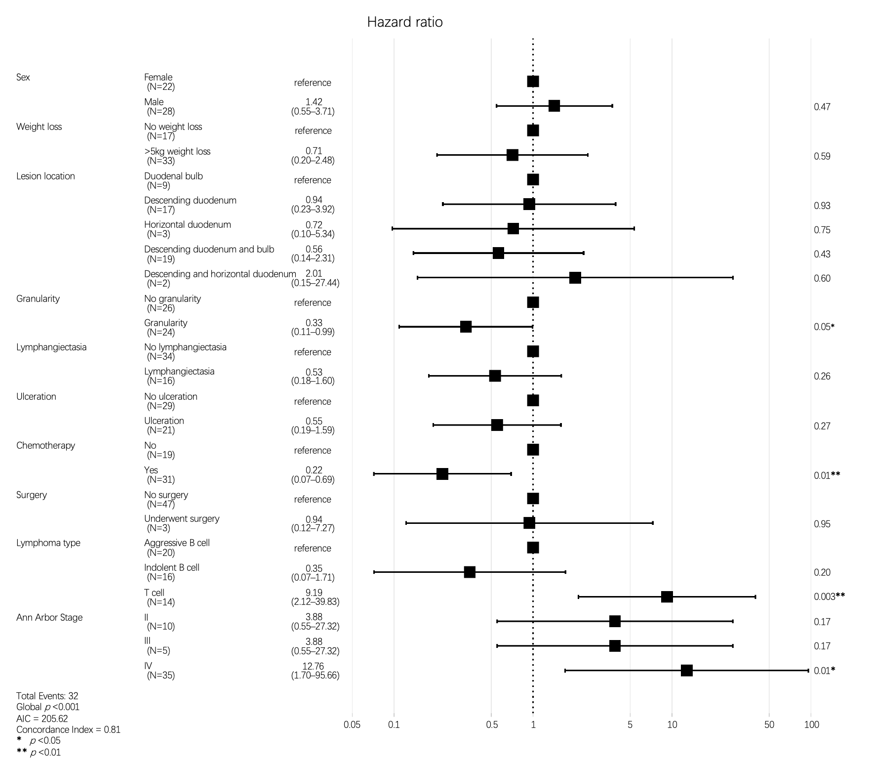 | Lymphangiectasia | 0.61 (0.28–1.37, p = 0.235) | 0.53 (0.18–1.60, p = 0.261) | |