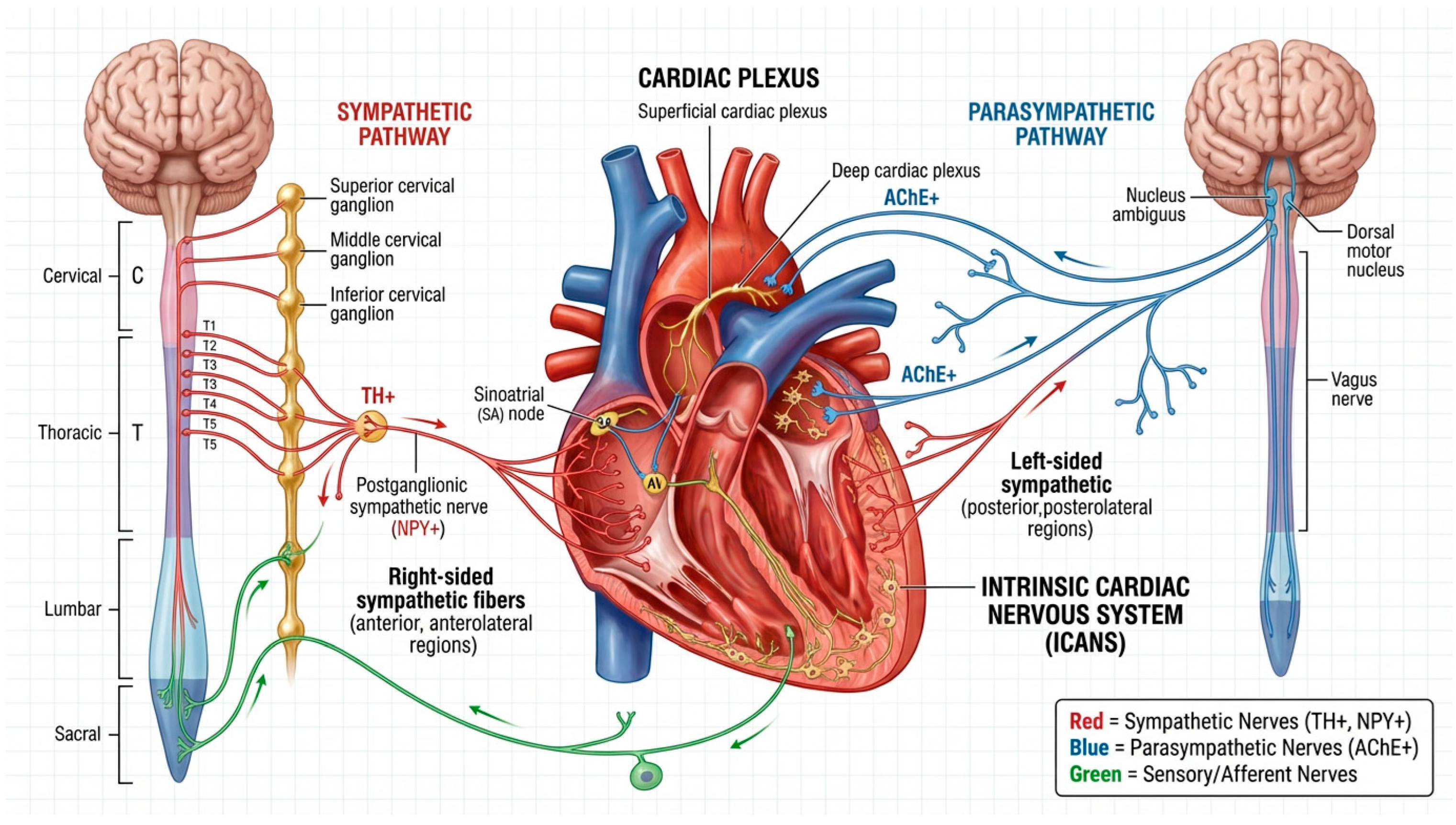 The intrinsic cardiac autonomic nervous system (ICANS) represents a local neuronal network composed of sympathetic, parasympathetic, sensory neurons, and interneurons located within the epicardium, myocardium, and endocardium. Armour et al. [