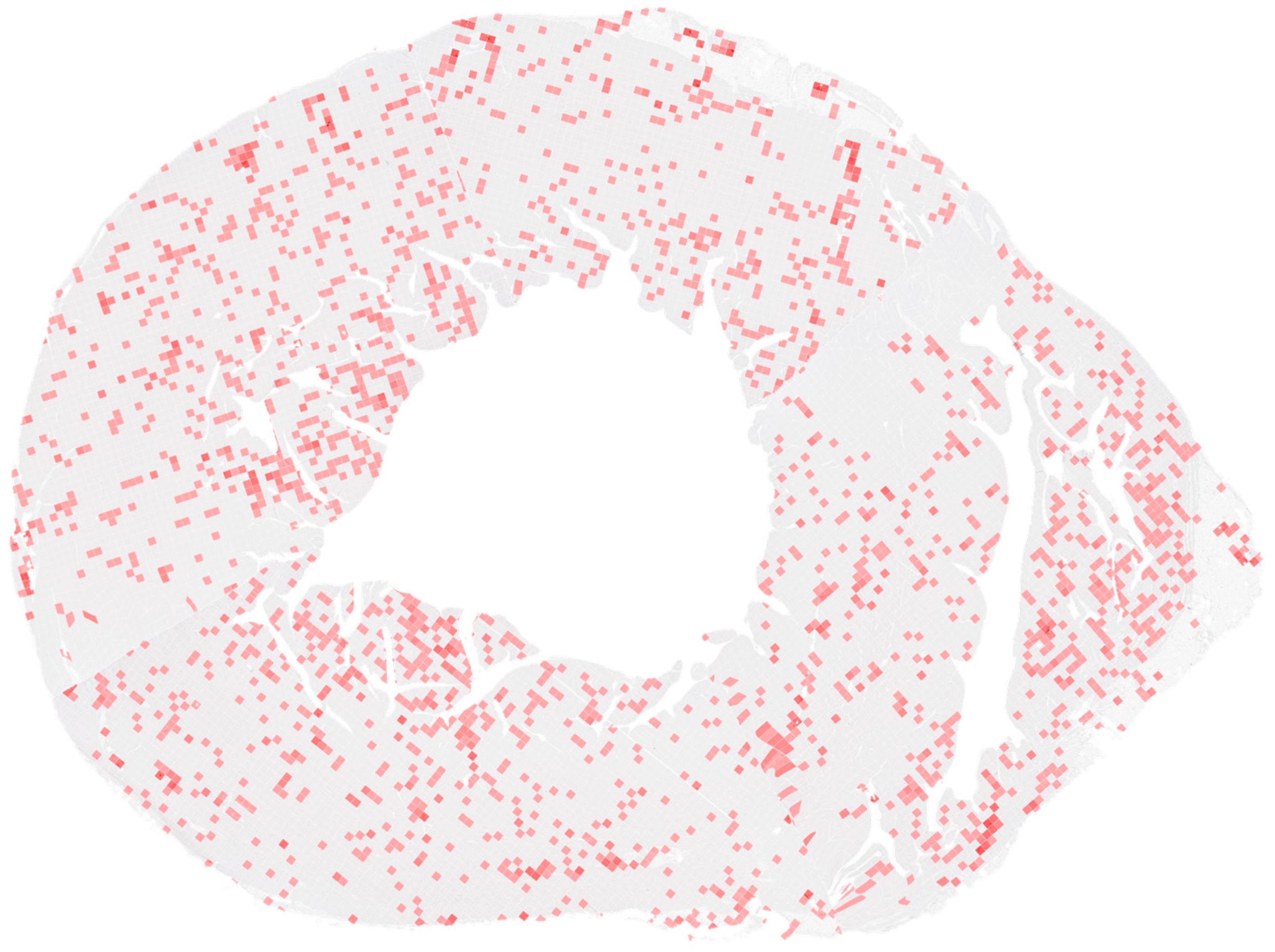 For visualisation, a fixed logarithmic colour scale was applied to ensure comparability between density maps from different slides. Low-density regions were represented by light shades of red, whereas higher densities were displayed as progressively darker and more saturated red tones. A semi-transparent overlay (alpha = 0.3) was applied to the original histological image, and a grid corresponding to the analysis window size was added to facilitate spatial interpretation.