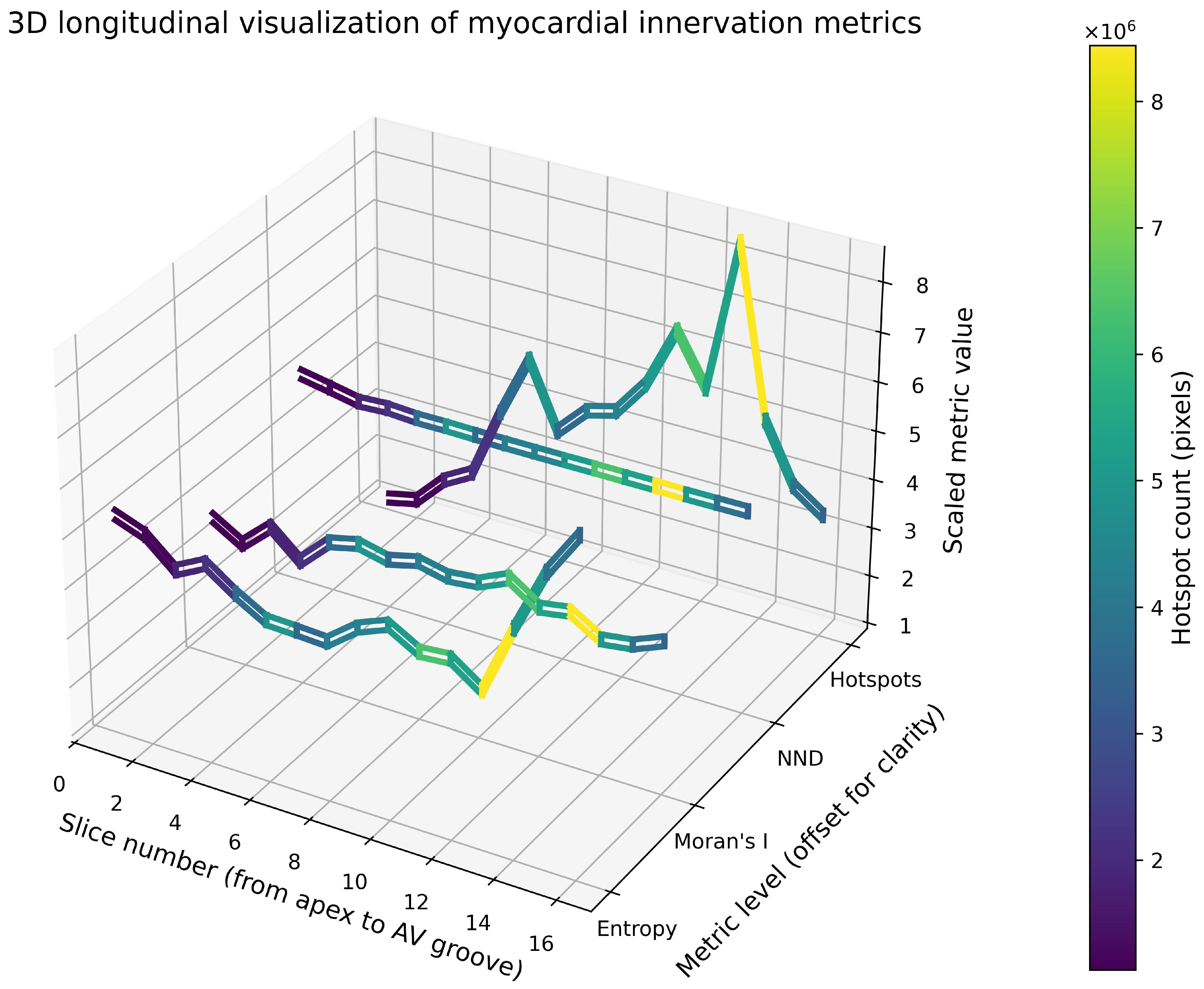 The atrioventricular (AV) groove exhibited the highest degree of spatial heterogeneity of innervation. Entropy reached 1.52, the maximum value among all analysed sections. Despite this heterogeneity, Moran’s I remained relatively high (0.80), indicating that clustering of nerve fibres was still present but organised in a more complex spatial configuration. The hotspot volume in this region was 3.40 million pixels, which was lower than in the mid- and upper-ventricular regions but higher than in the apical area. This distribution likely reflects the presence of large nerve trunks and ganglionated plexuses in the region of the atrioventricular groove (