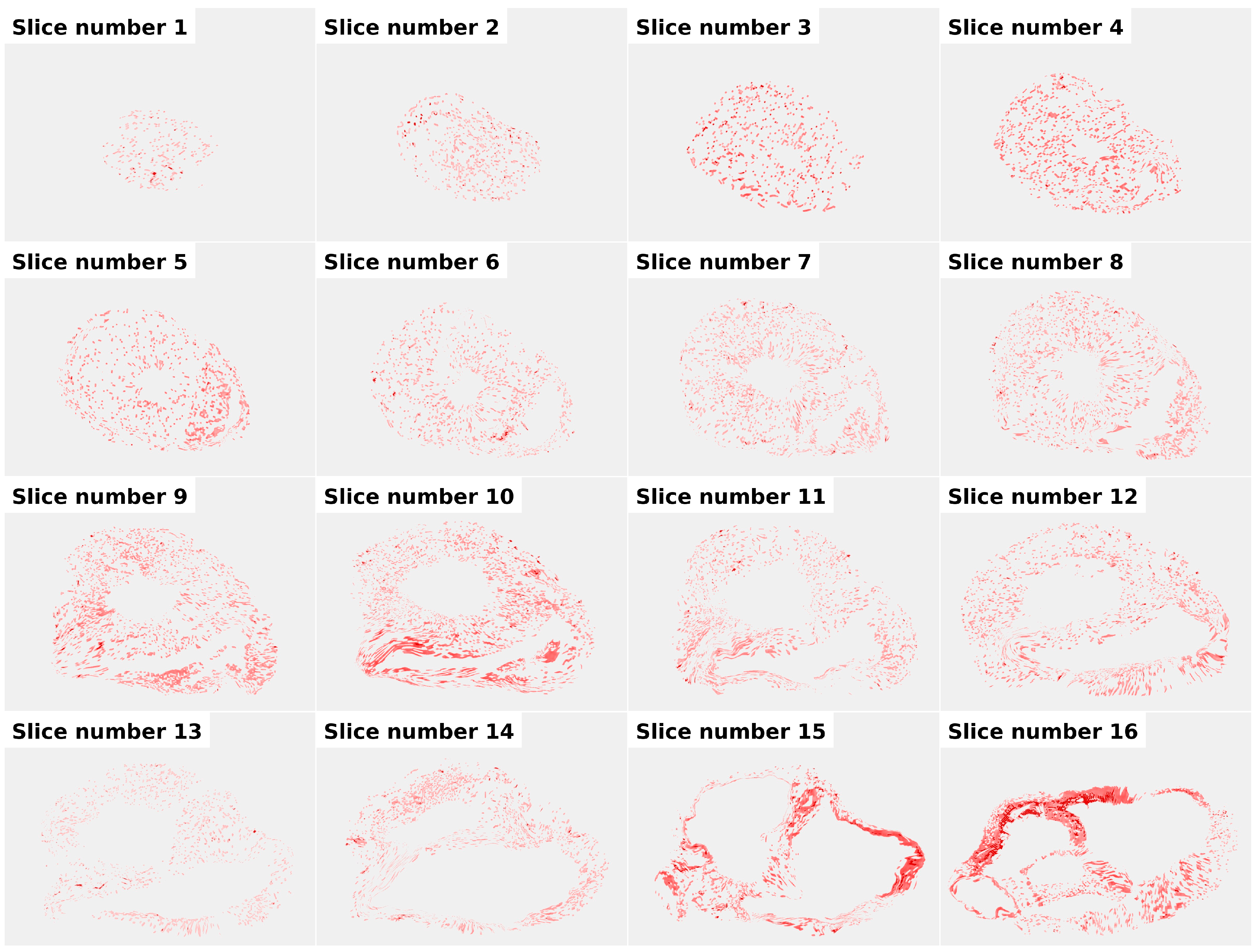 Following reconstruction of the histological myocardial rings, each ring was aligned with the corresponding MRI slices using several anatomical landmarks. Transformations were subsequently applied to the density masks (displayed in red) to scale the histological density maps to the spatial dimensions of the MRI slices.