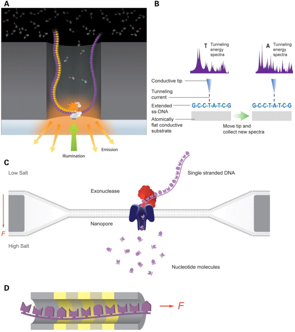 Third generation sequencing technologies. (a) Pacific biosciences technology, a DNA polymerase performs the synthesis while the base additions are detected with labeled phosphonycleotides. (b) Reveo technology, Single-Stranded DNA (ssDNA) molecules are stretched and further analyzed by Scanning Tunneling Microscope (STM). (c) Oxford nanopore technology, nucleotide translocation across a nanopore is measured. (d) IBM’s DNA transistor technology, individual bases of ssDNA are detected as they pass through a transistor channel. Adapted with permission from [59]. Copyright (2012) Oxford University Press.