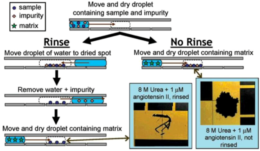 Digital microfluidic (DMF) systems are proven to be capable of handling the sample processing in Mass Spectrometry (MS), Electrowetting on Dielectrics (EWOD) combined with Matrix assisted laser desorption/ionization (MALDI). Reprinted with permission from [112], Copyright (2005) American Chemical Society.
