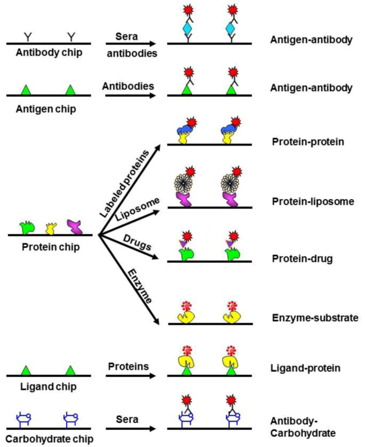 Protein Microarray: Protein arrays can impact our understanding of protein structure and function in the same way that DNA arrays provided insight into gene expression and regulation. There are commonly two types of array modality: functional and analytical protein microarrays, as illustrated in Figure 4 [118]. Functional protein microarrays are usually applied to analyze a genomic set of proteins. In this type of array, individual proteins are separately spotted on a surface such as a glass slide and then analyzed for activity. This approach has the potential for rapid high-throughput analysis of large collections of proteins and cellular proteomes, and promises to transform the pharmaceutical industry. A second type of protein microarray is the analytical microarray. Here, a genomic set of protein-specific ligands such as nucleic acid aptamers, antibodies, or chemical probes are spotted on a microarray, and then the proteins in an extract can be quantified in parallel by binding extracted proteins to the microarray. The scientific community is starting to realize the potential of analytical protein microarrays to monitor protein expression on a proteome-wide scale and in medical diagnostics. For example, protein microarray was recently applied in the diagnosis of complex disease such as acute myocardial infraction [80], autoimmune disease [81], and cancer [82]. A critical step in generating a practical protein array has been the development of general methods for arraying a large set of proteins without denaturing them and at enough density for detection of interactions.
